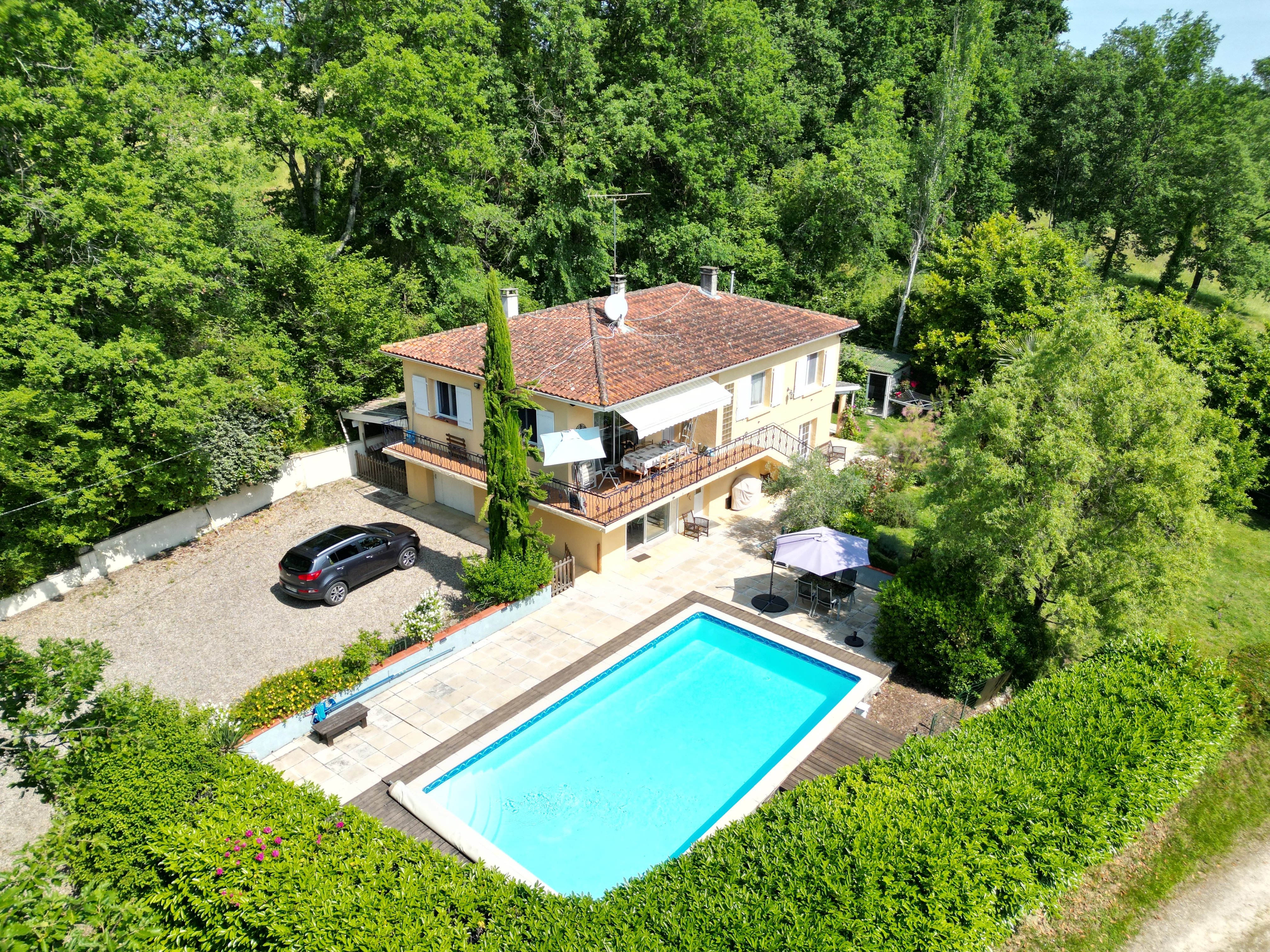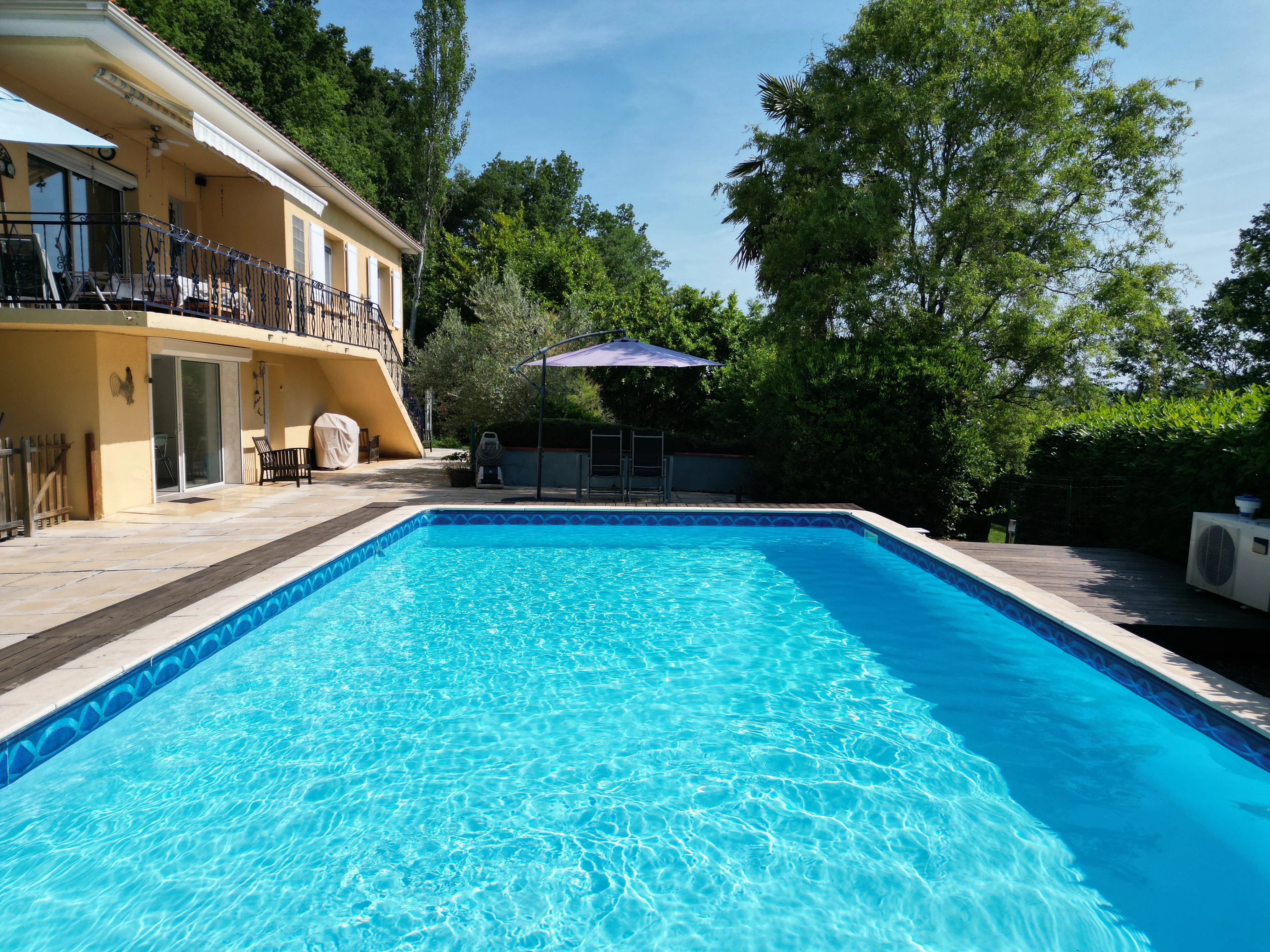 La maison se compose d'un hall d'entrée, salon / salle à manger avec des portes-fenêtres qui mènent à un balcon enveloppant extérieur, parfait pour manger toute l'année; Chauffage central au fuel; Poele à bois dans le salon; Cuisine (équipée); Buanderie, trois chambres doubles; buanderie; Salle de bain avec douche à l'italienne spacieuse; Un escalier depuis le couloir mène à l'appartement indépendant avec hall d'entrée, cuisine ouverte / salon / salle à manger ouvrant sur la piscine, 2 chambres, une salle de douche et un buanderie. Sur ce niveau, il y a aussi un garage intégral double longueur. EXTÉRIEUR: Double garage et un système de drainage septique nouvellement installé. Jardins bien entretenus; Grand niche à chien; Piscine 10 x 5 (chauffée); Situé à proximité de la ville-château de Duras, à 48 km de Bergerac et à 79 km de Bordeaux.