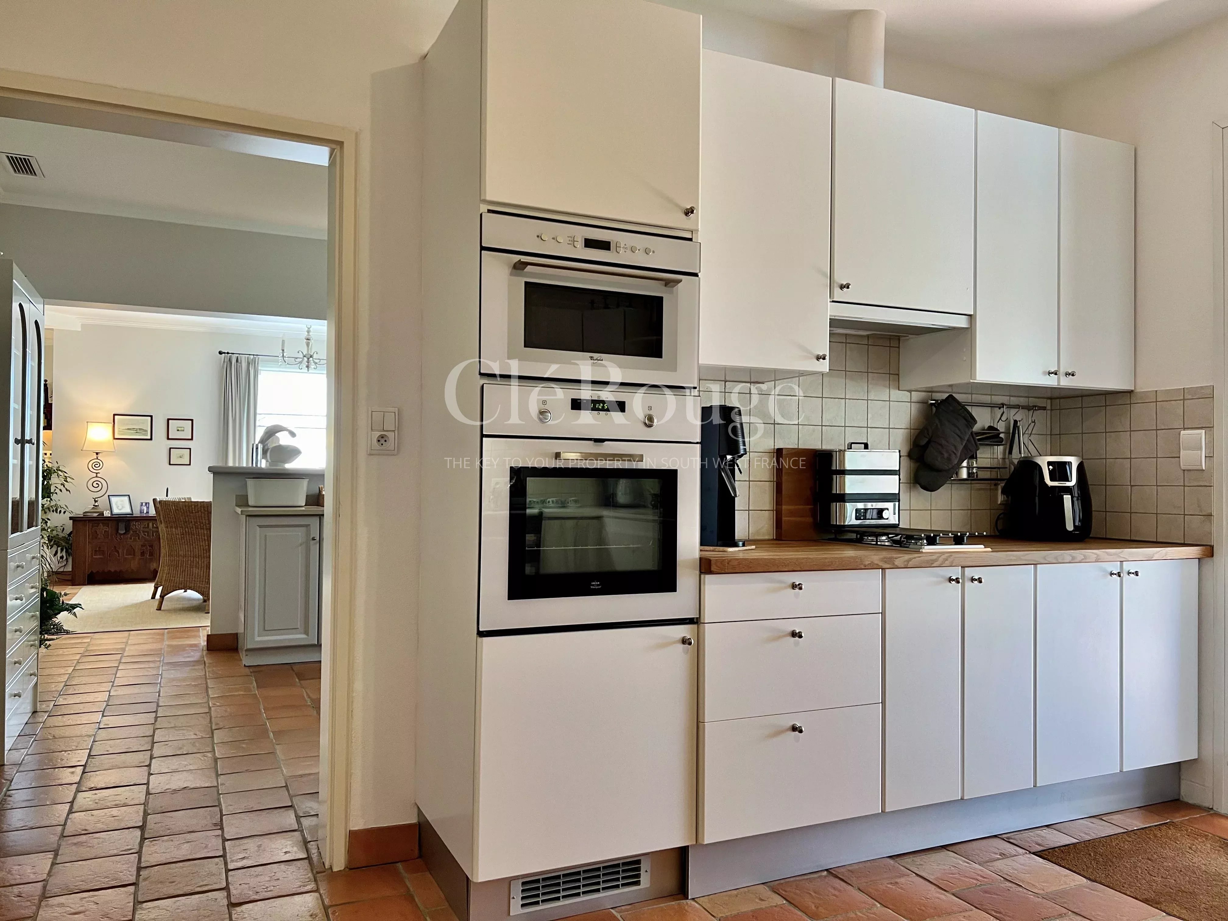 La cuisine ouverte, entièrement équipée, dispose également d'une arrière-cuisine pratique, parfaite si vous aimez recevoir lors de réceptions.
