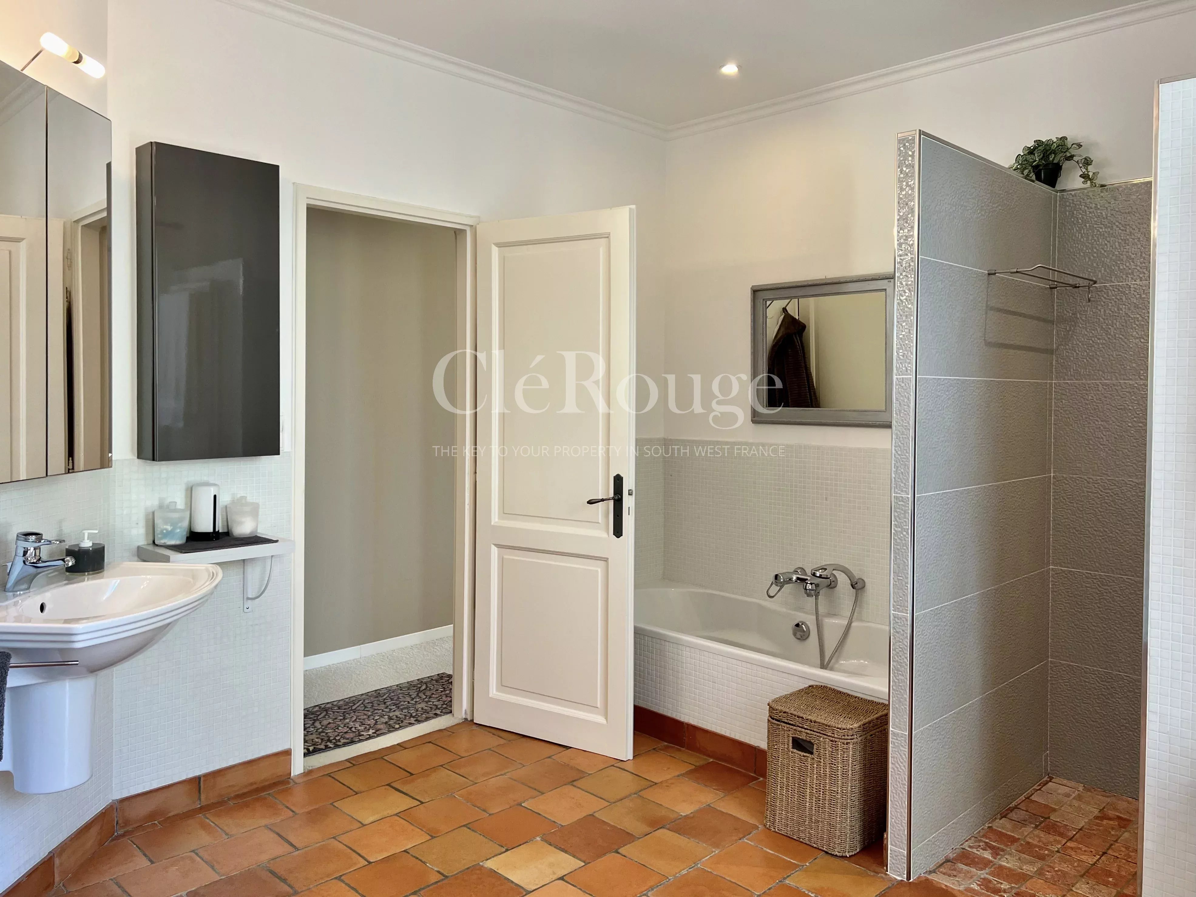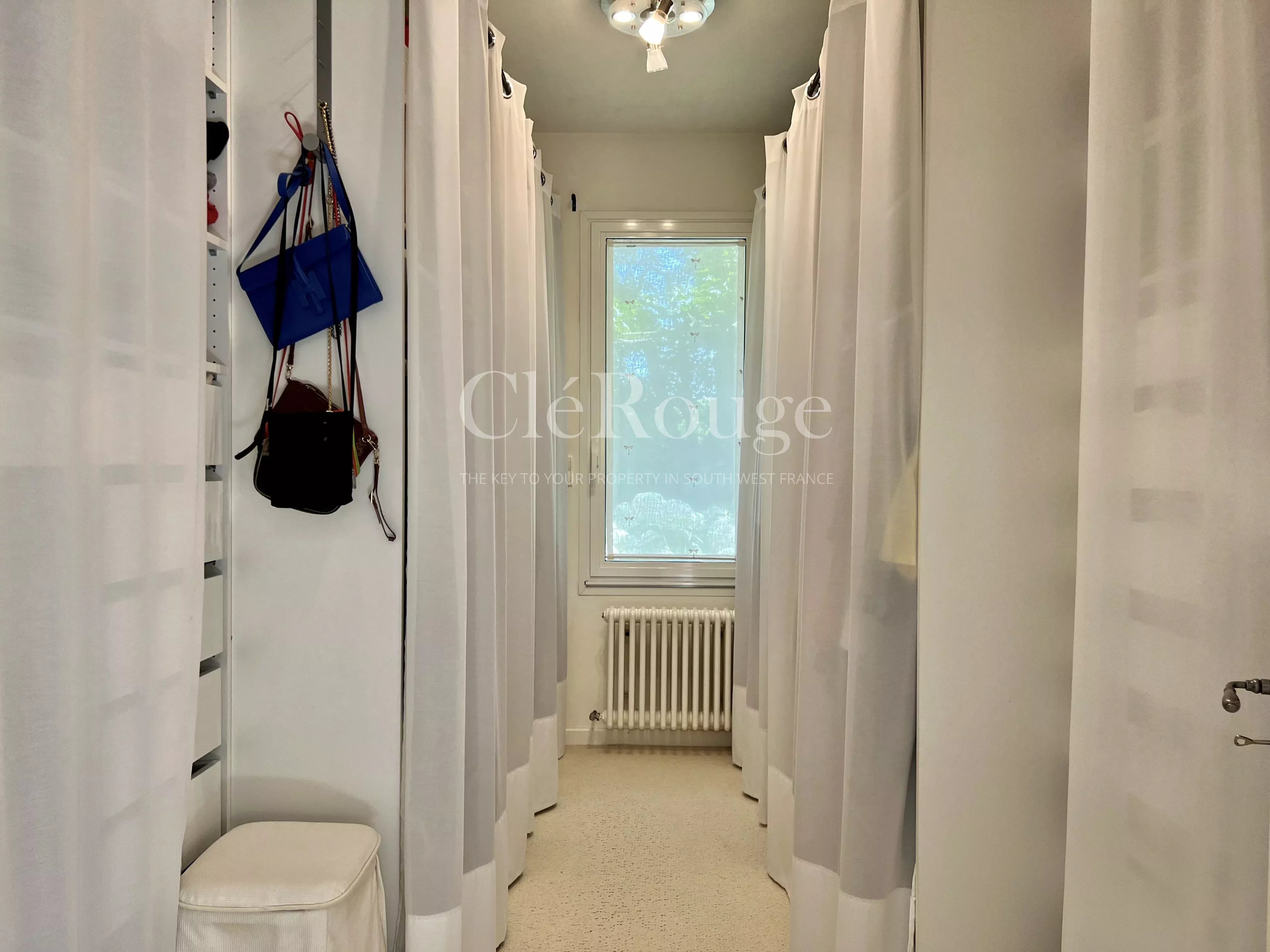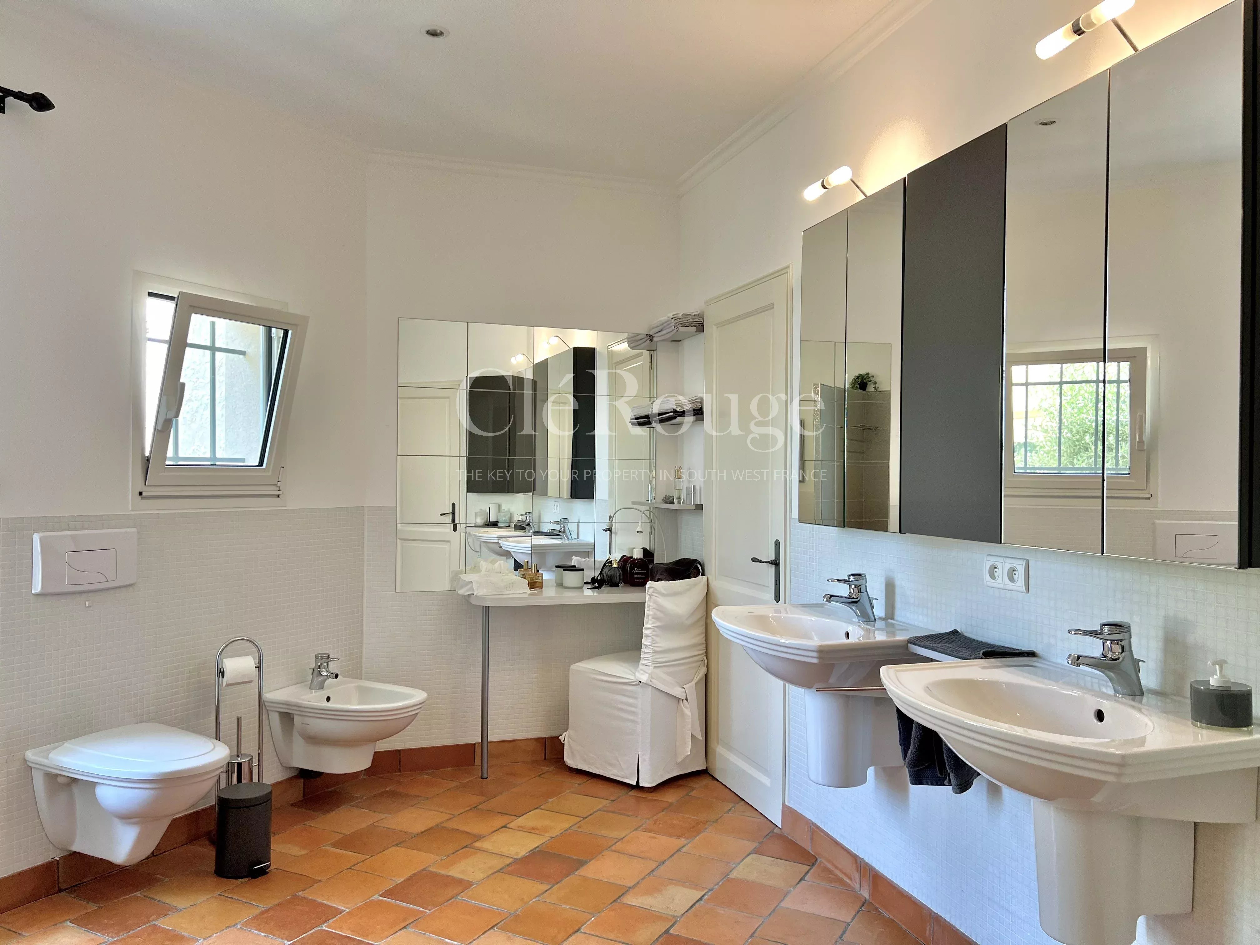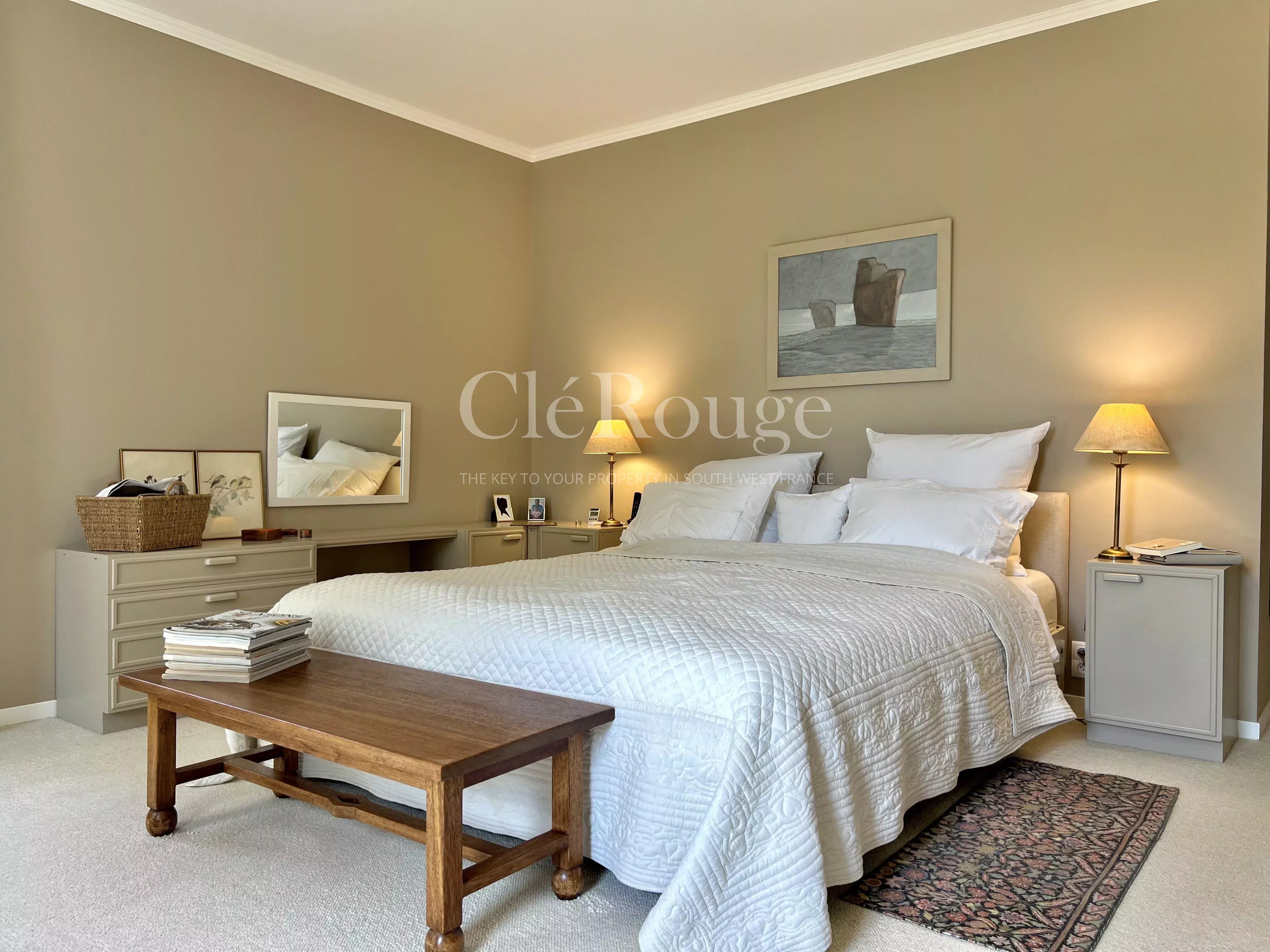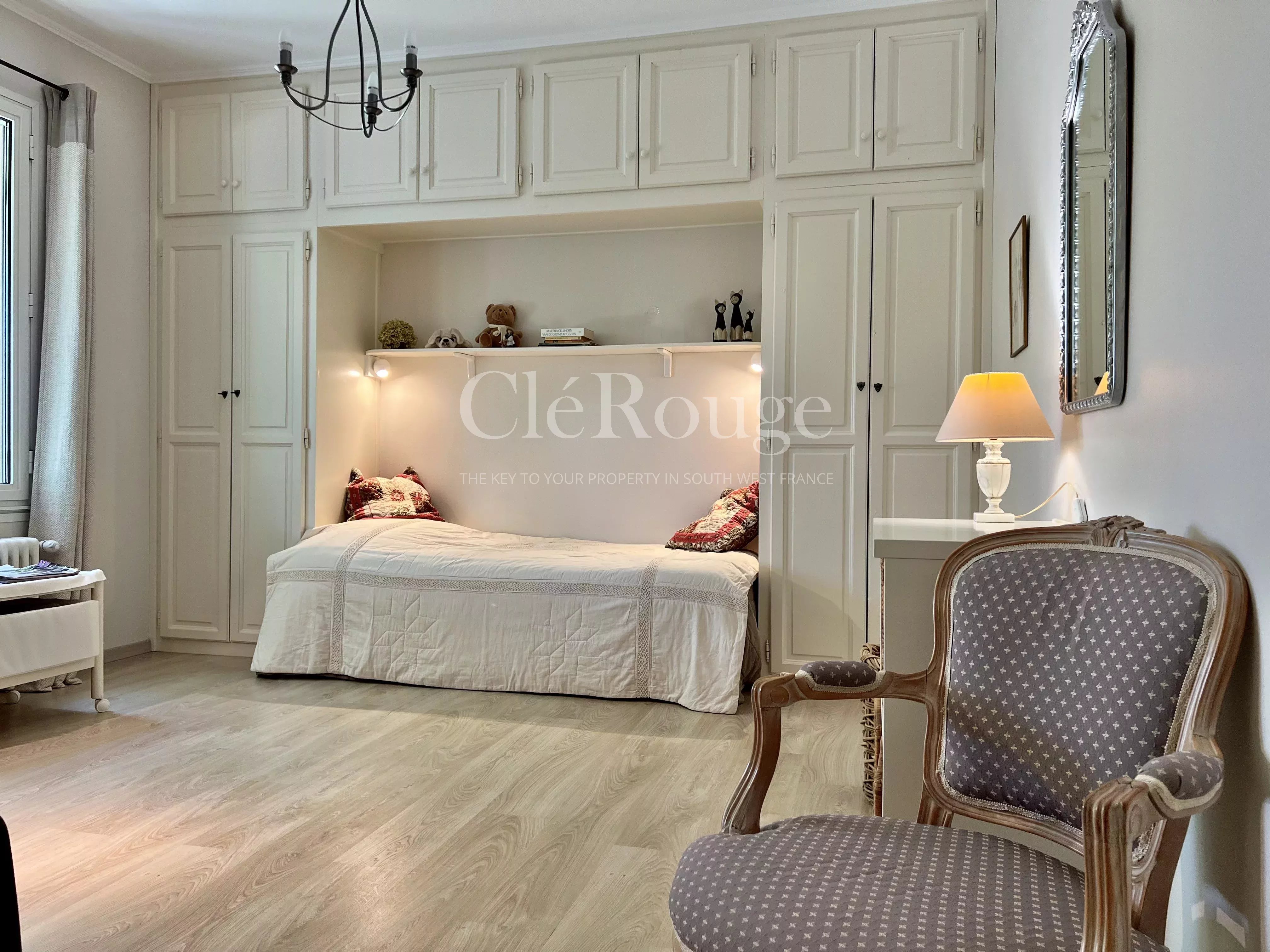 Un couloir dessert un bureau/bibliothèque ainsi que deux chambres confortables. L'une d'elles est dotée d'un dressing et d'une salle de bains privative avec climatisation réversible. Une autre salle d'eau vient compléter cet espace.