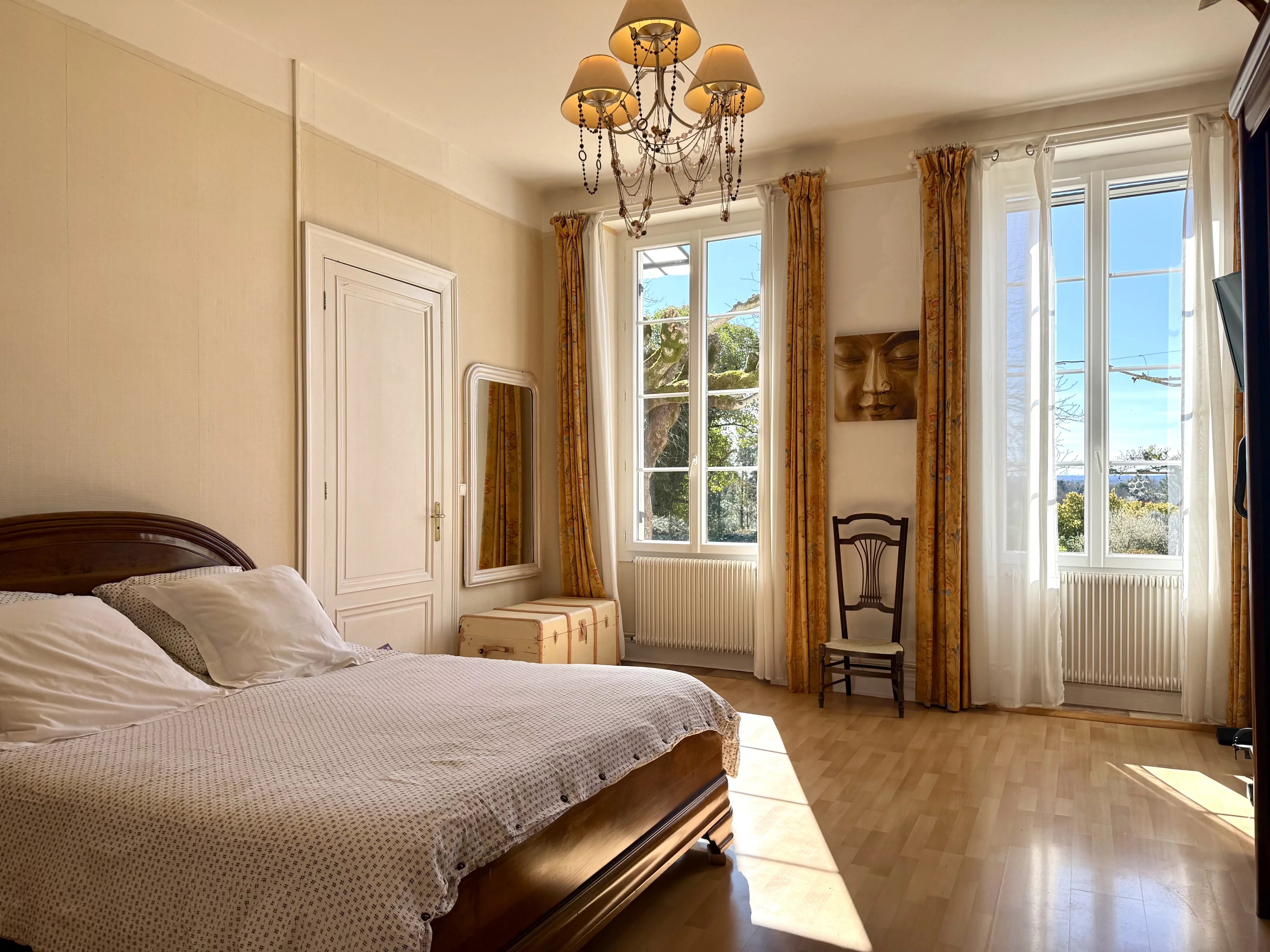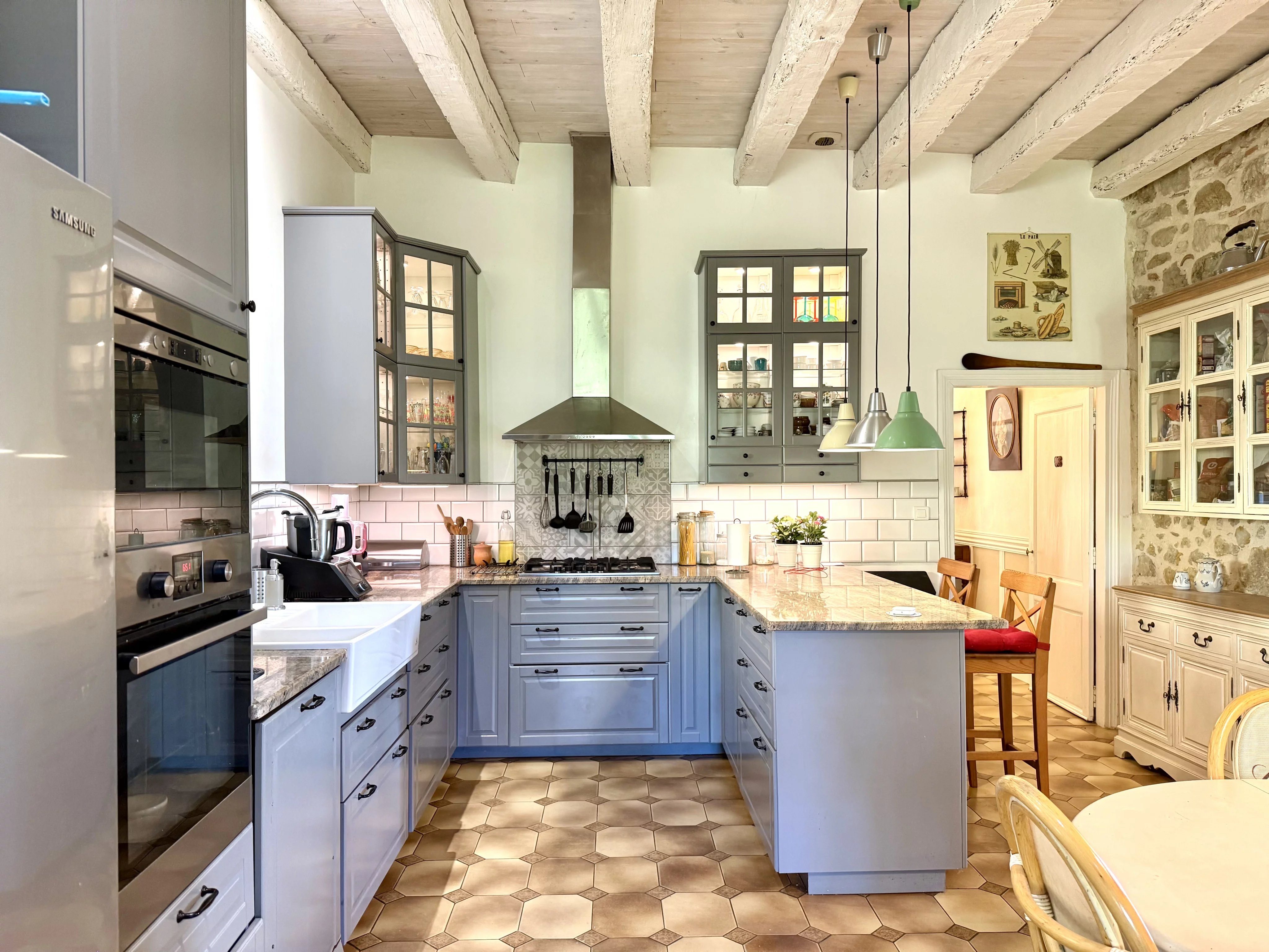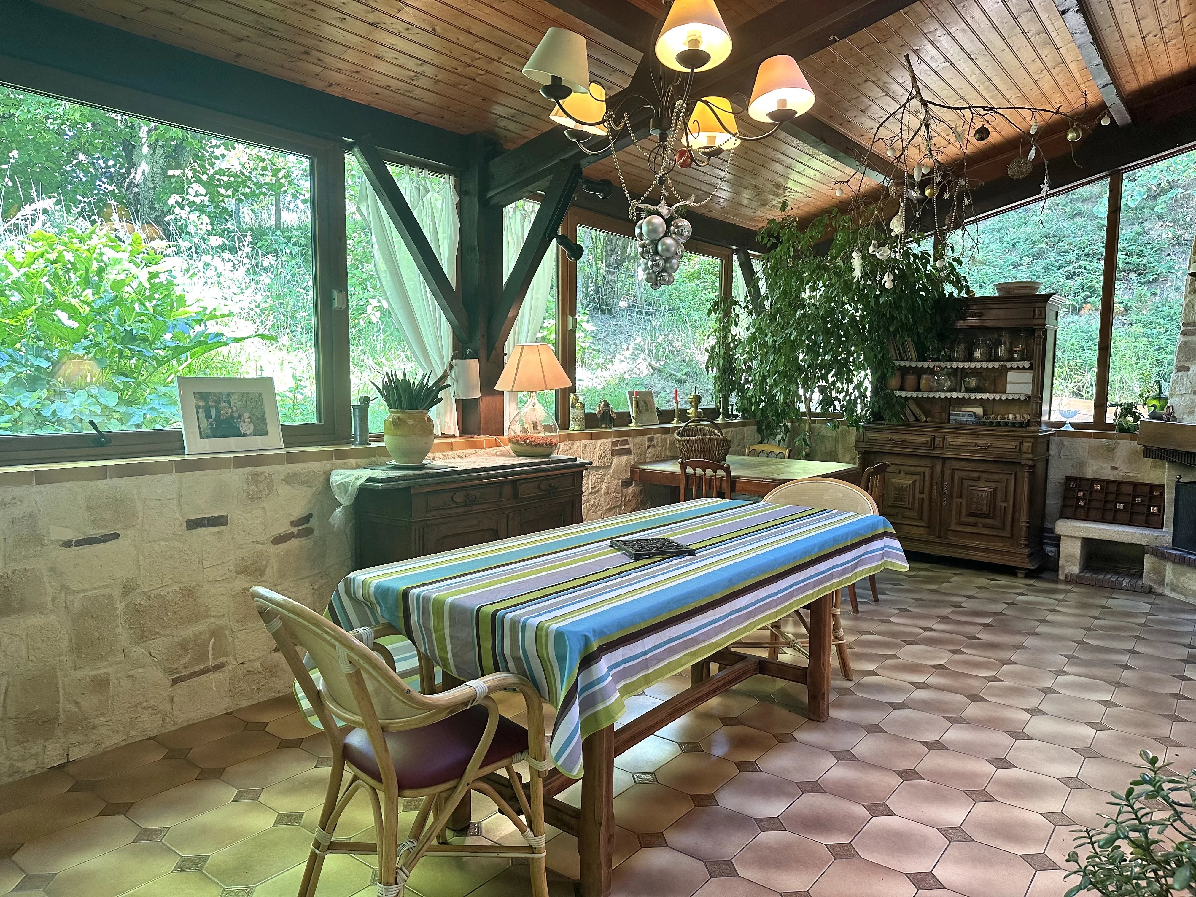 Cette demeure de plain-pied offre un subtil mélange du charme rustique de son origine et du confort moderne. L'intérieur propose un séjour lumineux, une cuisine équipée et une véranda utilisée aujourd'hui comme salle à manger. La maison compte cinq chambres spacieuses et deux salles d'eau. Deux de ces chambres, accompagnées d'une cuisine, sont situées à une extrémité de la maison et disposent d'un accès indépendant ainsi que d'une terrasse privative - une configuration parfaite pour l'aménagement d'un gîte.