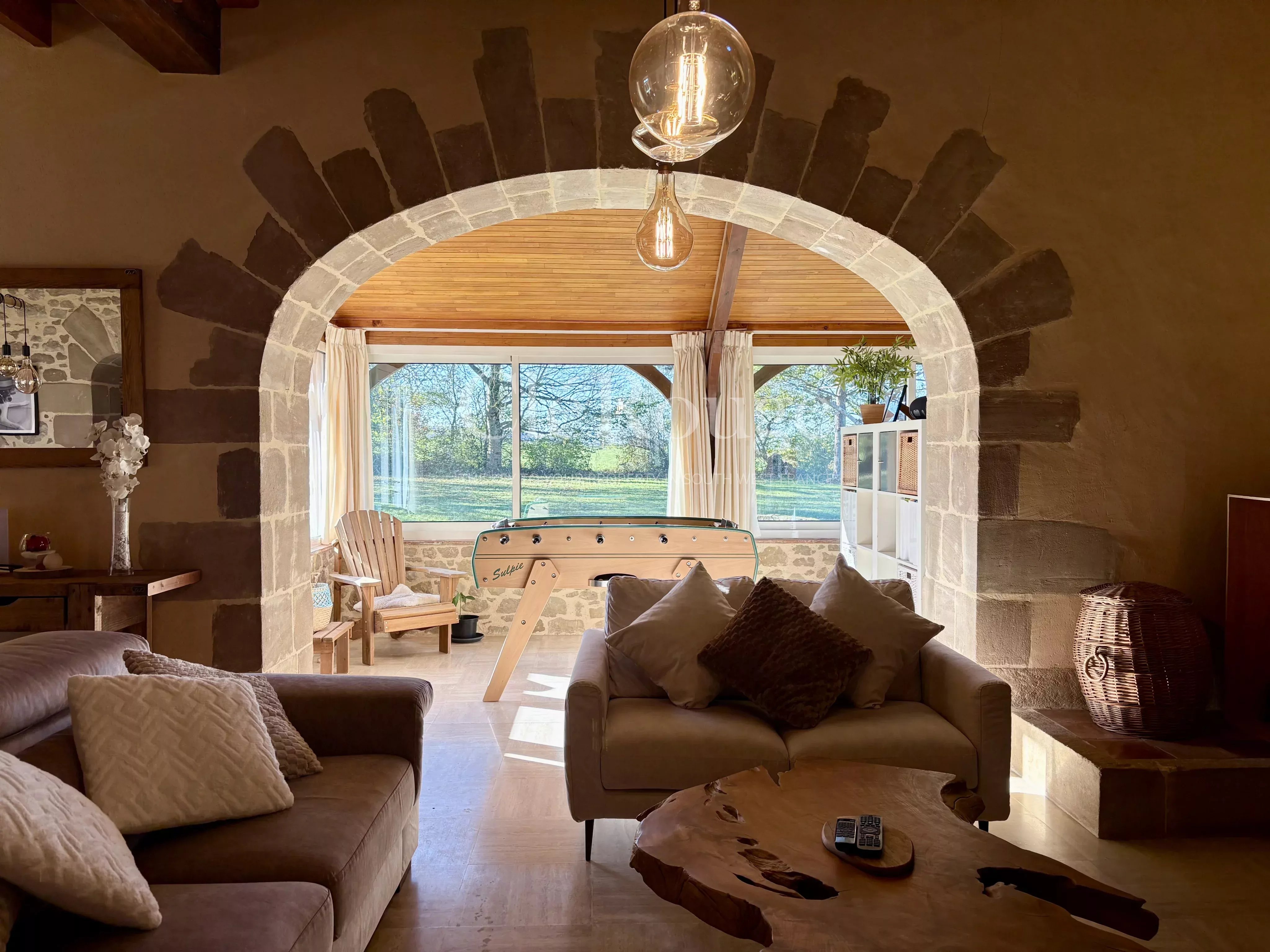 À l'entrée de cette superbe ferme rénovée, l'on découvre un vaste espace de vie ouvert, baigné de lumière tout au long de la journée. Une belle cheminée y ajoute une note chaleureuse et raffinée, créant une ambiance accueillante dès les premiers instants. L'ensemble offre une circulation fluide entre les volumes, invitant naturellement à partager et à se détendre.