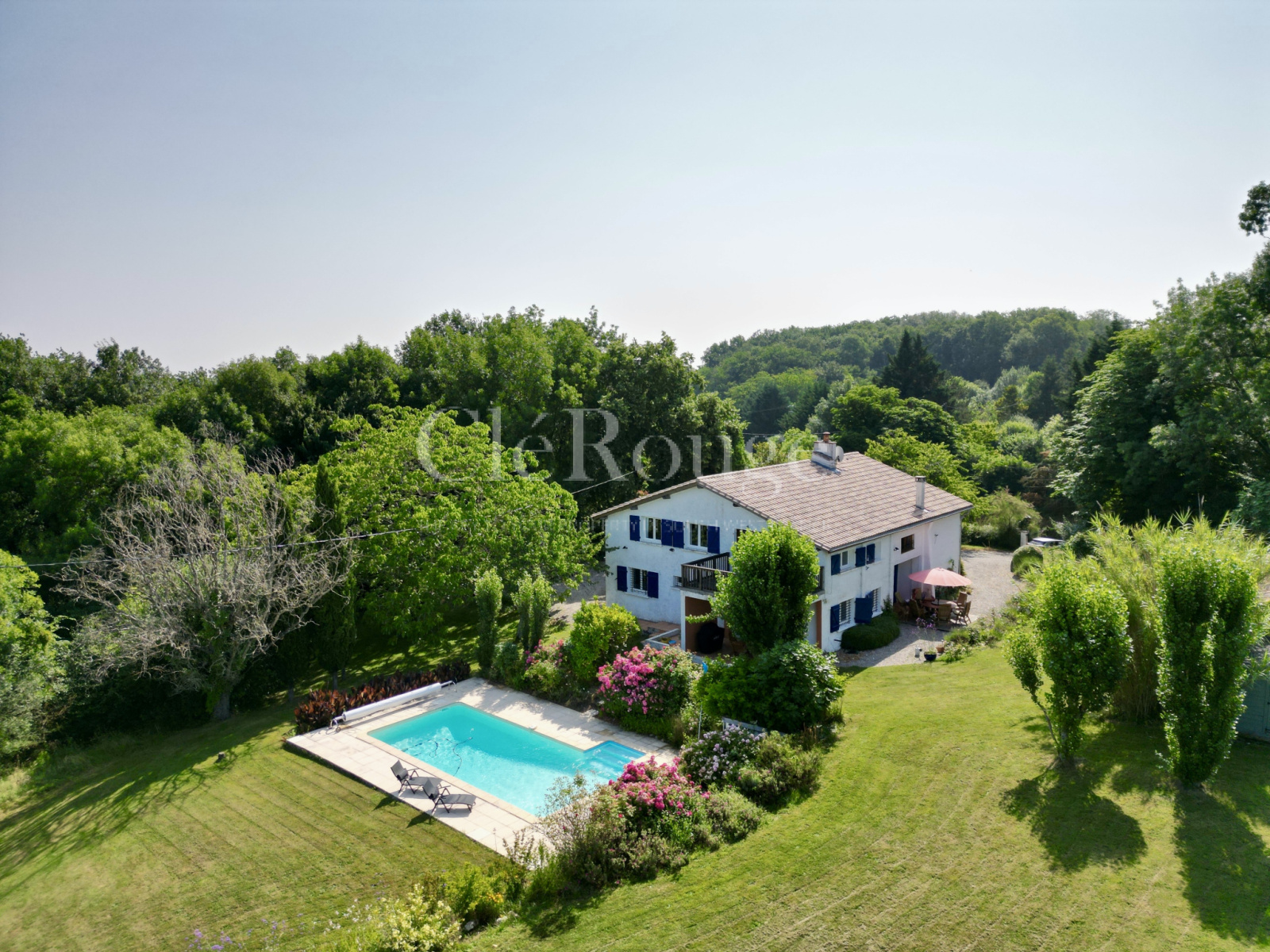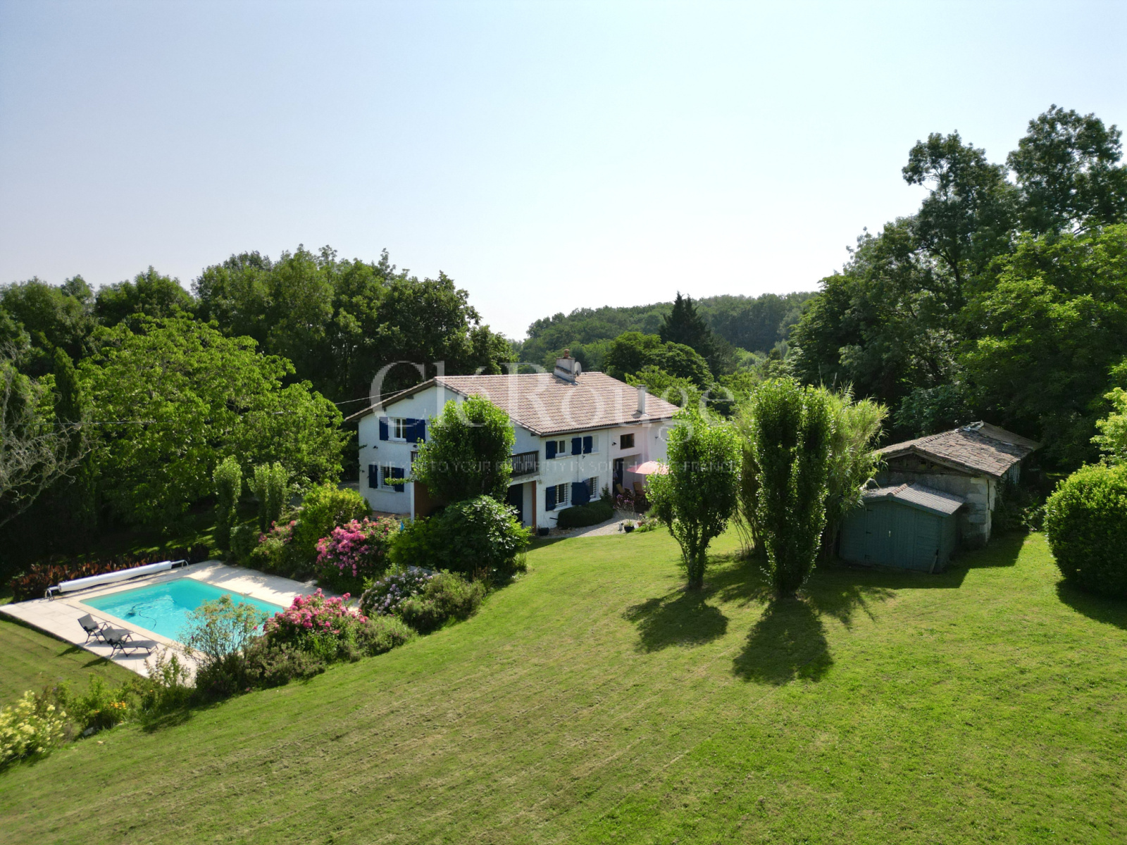Le terrain, sans vis-à-vis, comprend une piscine entourée d’une terrasse. Un garage attenant et une grange offrent des espaces supplémentaires pour le rangement ou l’aménagement.