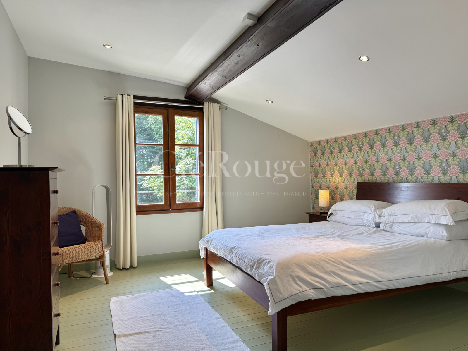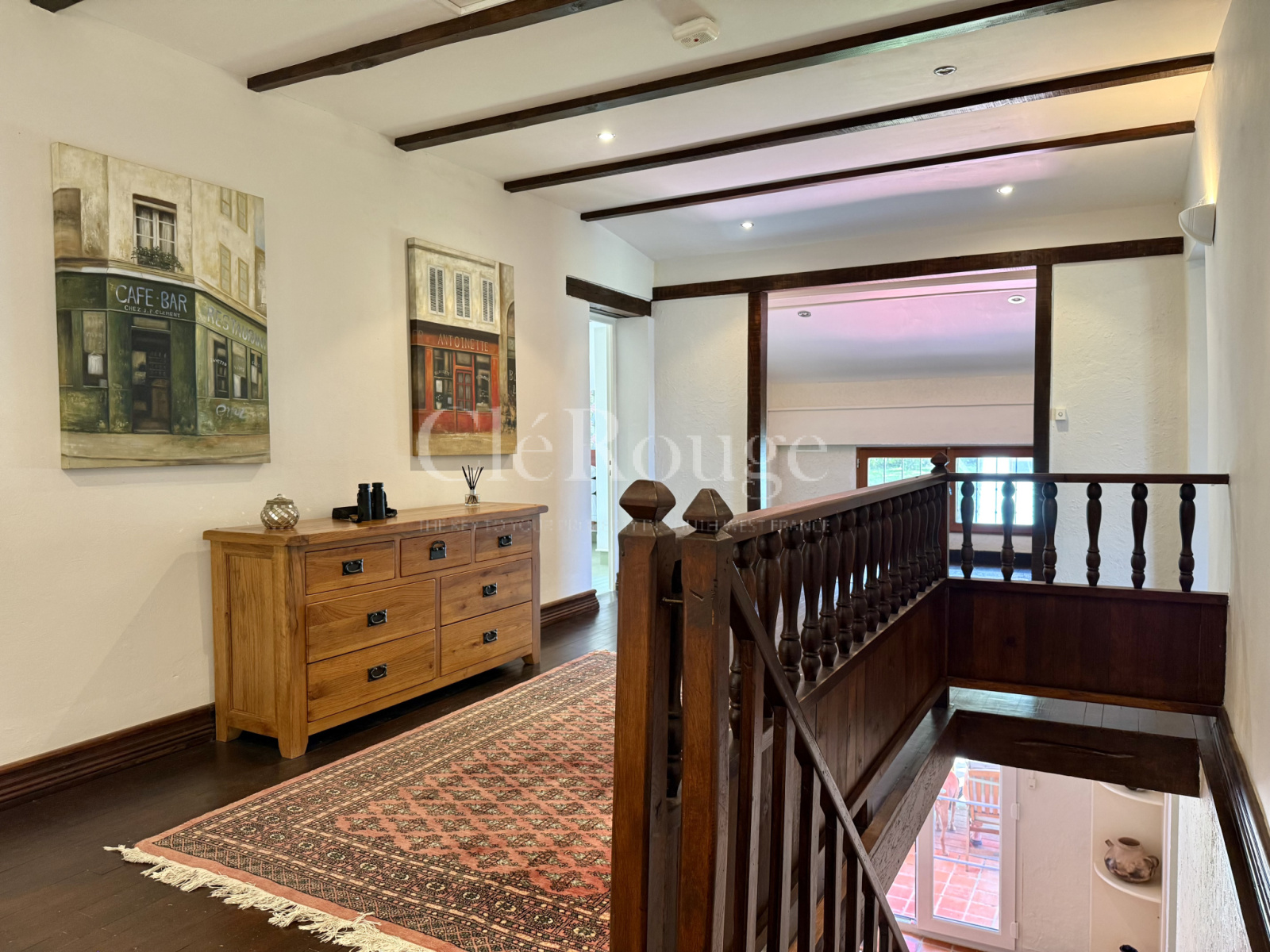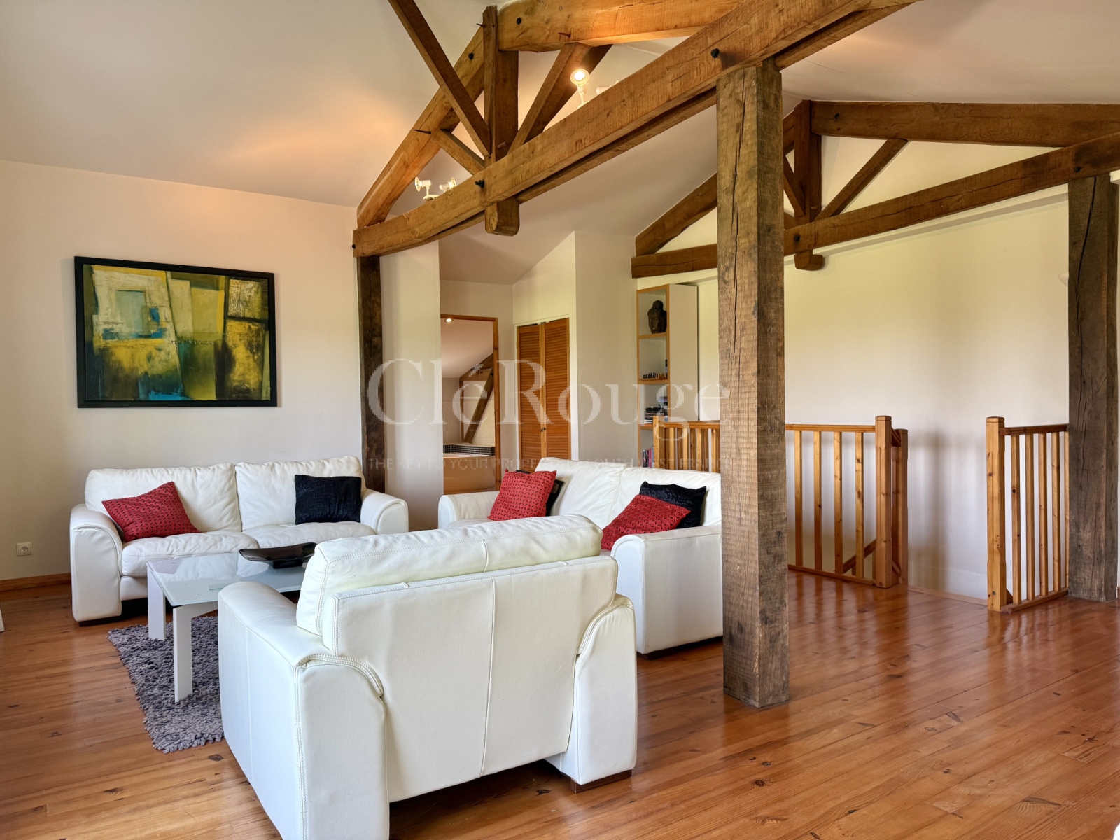 Deux escaliers distincts permettent d’accéder à l’étage, chacun menant à une zone différente : l’un arrive dans un salon avec balcon donnant sur la campagne, accompagné d’une chambre avec salle d’eau privative et d’un bureau; l’autre mène à un grand palier desservant trois chambres et une salle de bains. Les deux parties de l’étage communiquent entre elles, formant un espace unique et fluide.