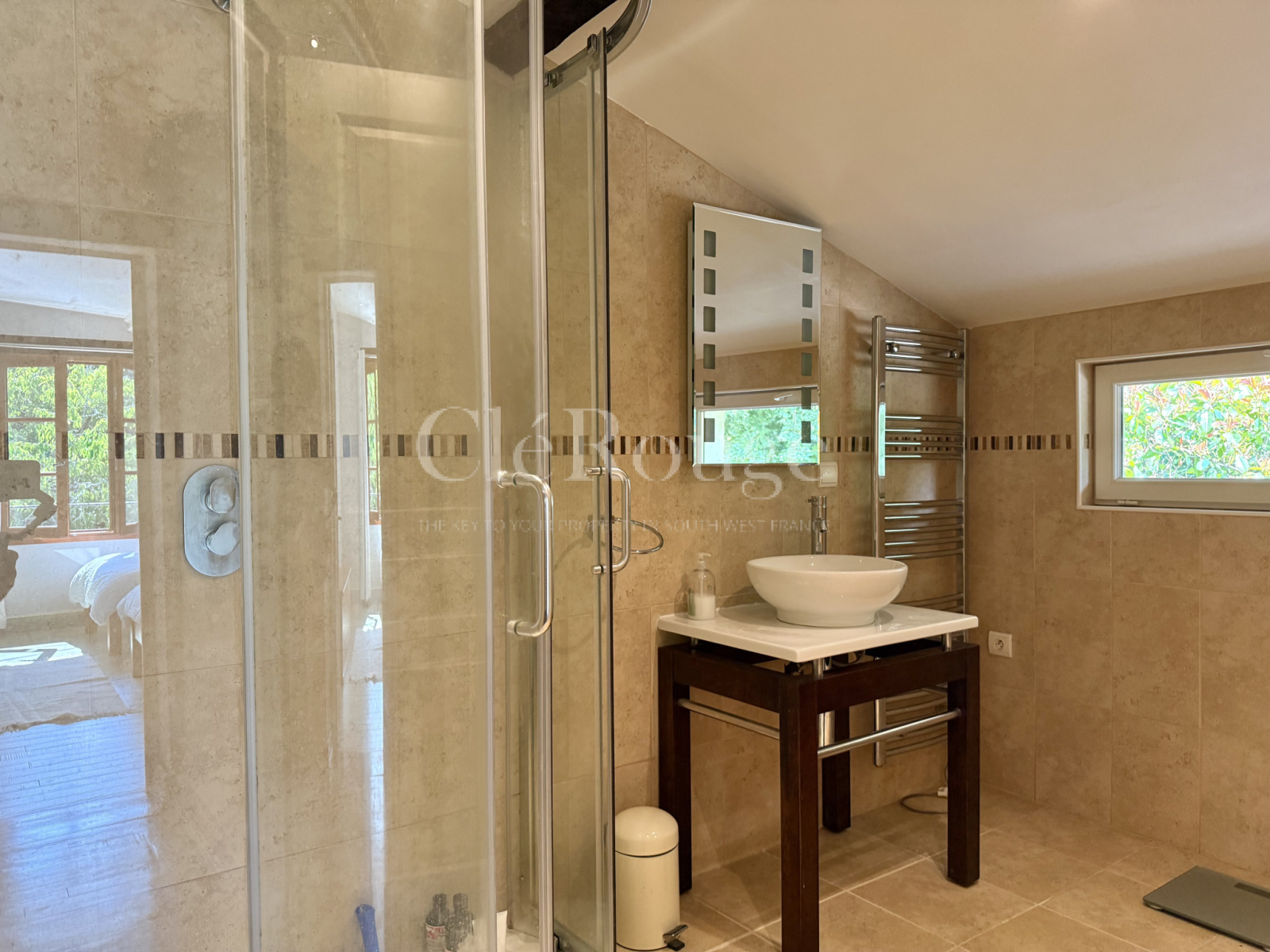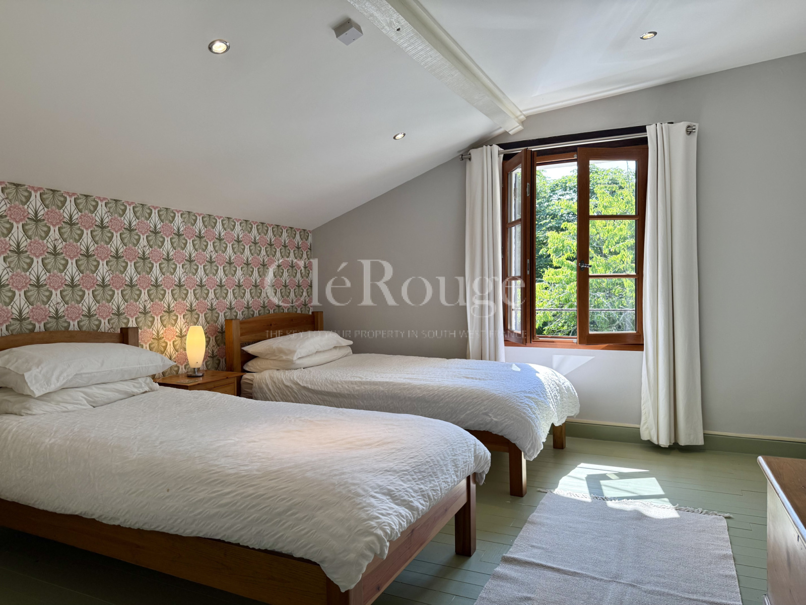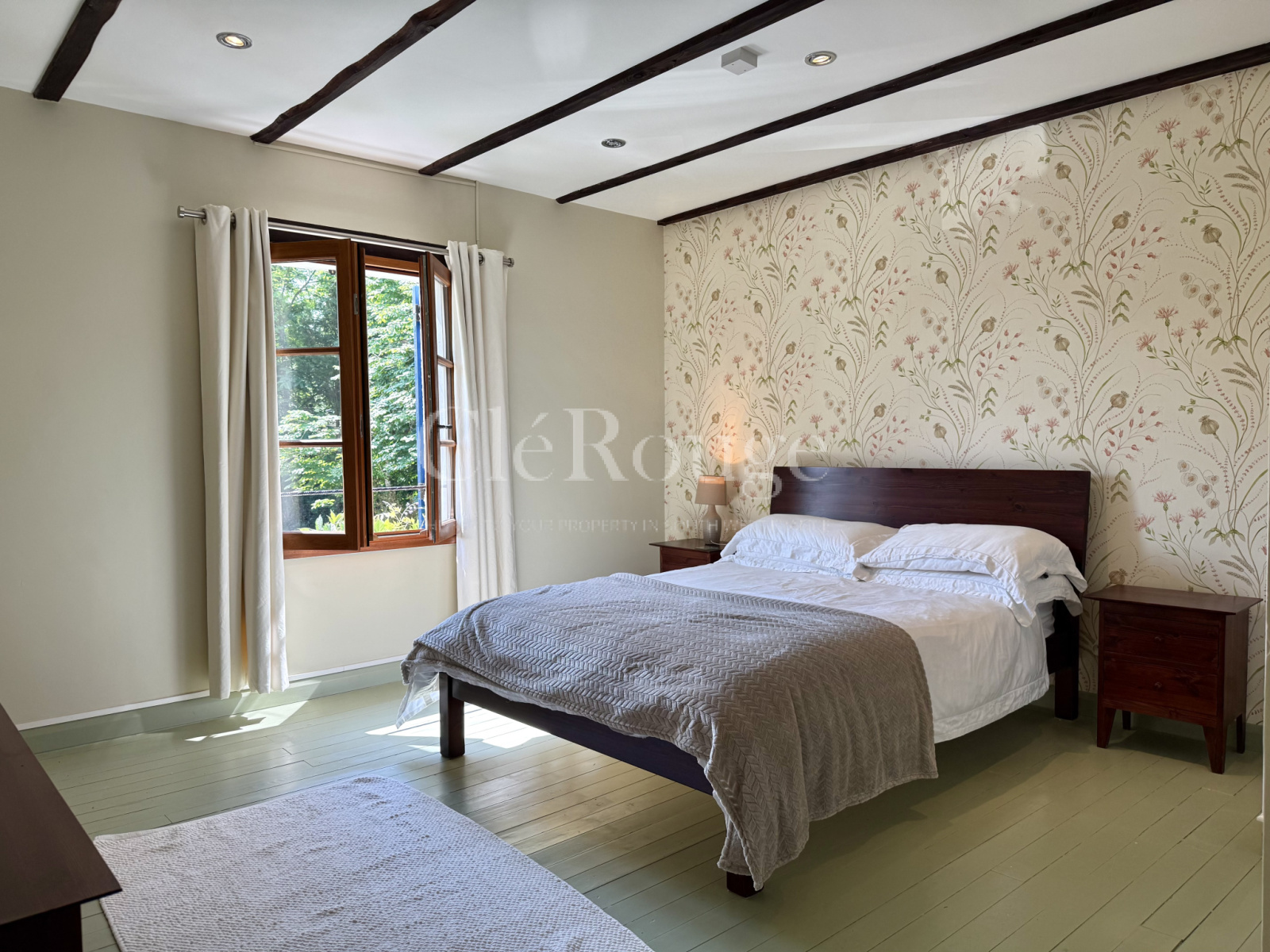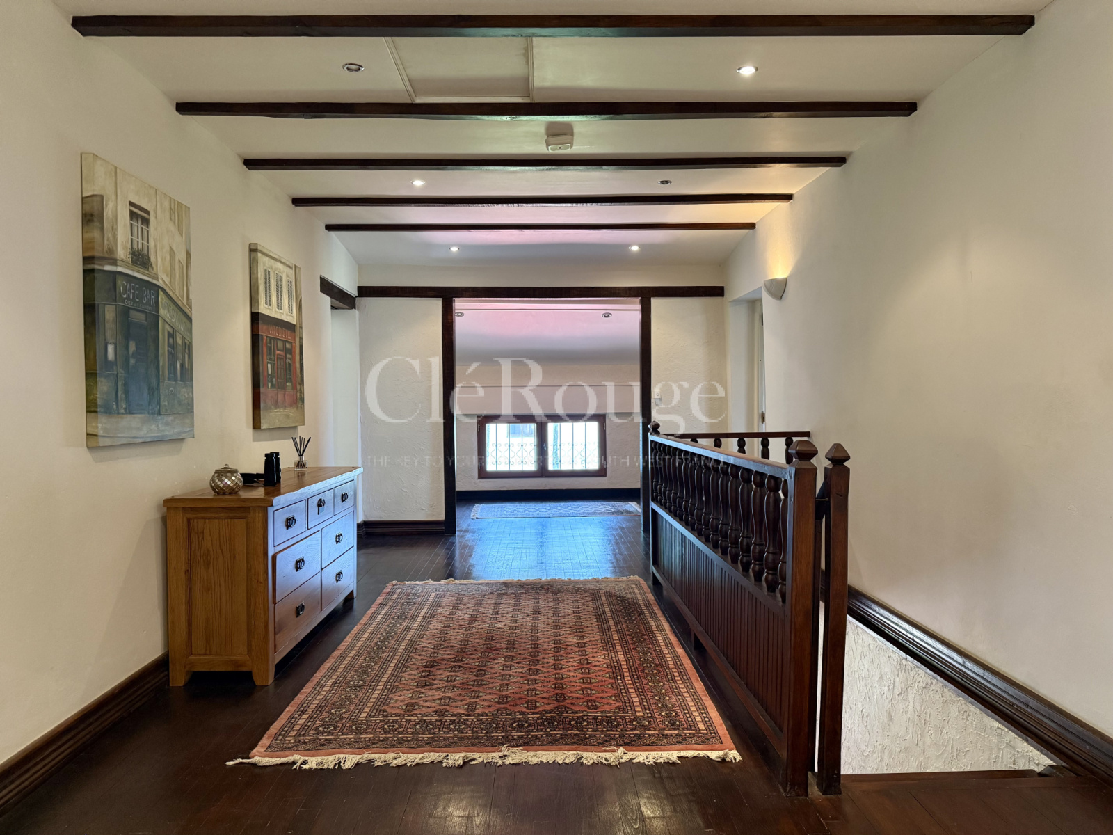 Deux escaliers distincts permettent d’accéder à l’étage, chacun menant à une zone différente : l’un arrive dans un salon avec balcon donnant sur la campagne, accompagné d’une chambre avec salle d’eau privative et d’un bureau; l’autre mène à un grand palier desservant trois chambres et une salle de bains. Les deux parties de l’étage communiquent entre elles, formant un espace unique et fluide.