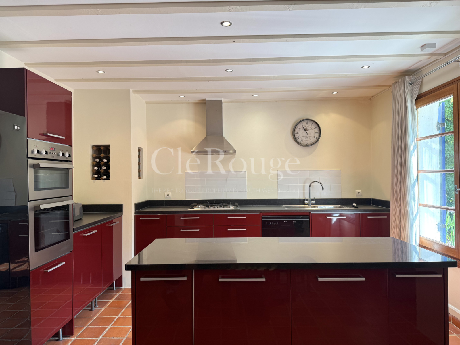 Au rez-de-chaussée, une grande entrée centrale dessert, sur la gauche, une cuisine avec coin repas, une buanderie et une chambre avec salle de bains. Sur la droite, une seconde cuisine ouverte sur un séjour. En face de l’entrée, une pièce supplémentaire actuellement utilisée comme buanderie avec salle d’eau.