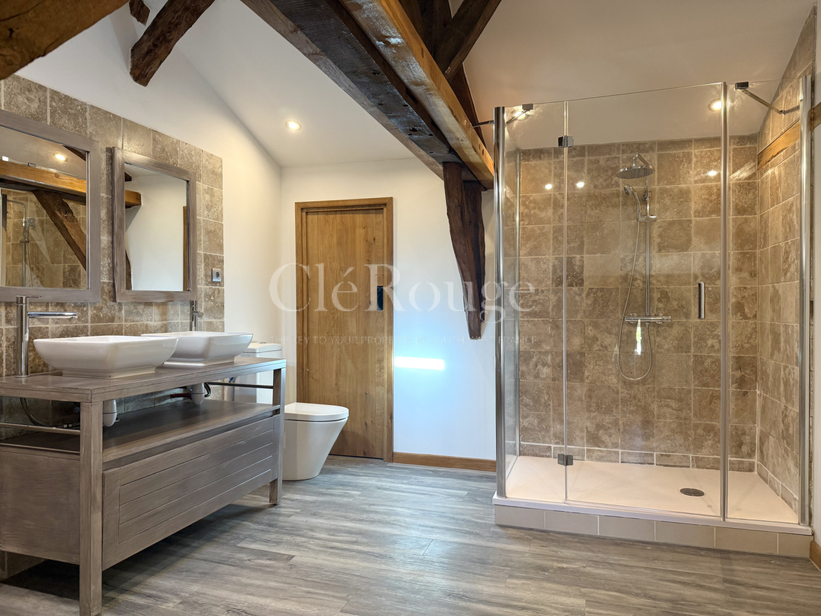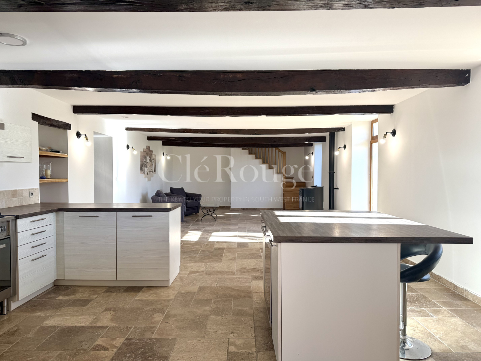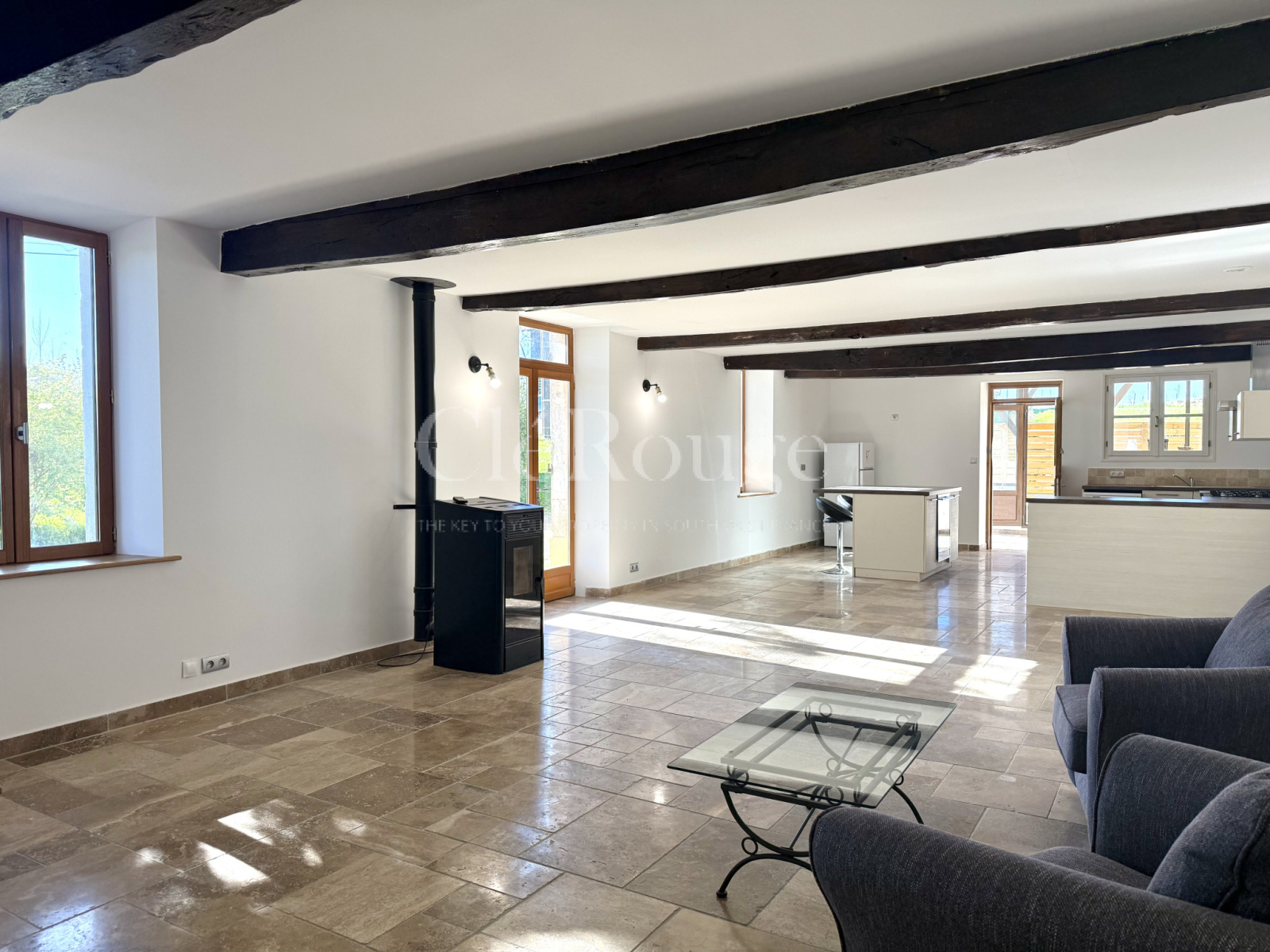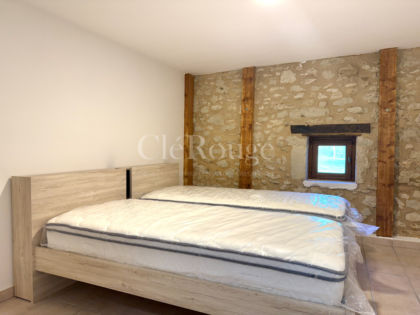 La propriété se compose de deux bâtisses principales. La première est un ancien séchoir, rénové sur une moitié, comprenant une cuisine ouverte sur un salon chaleureux, et à l’étage, deux chambres en suite. L’autre moitié, encore non aménagée, est actuellement utilisée comme garage mais offre un potentiel d’aménagement supplémentaire.