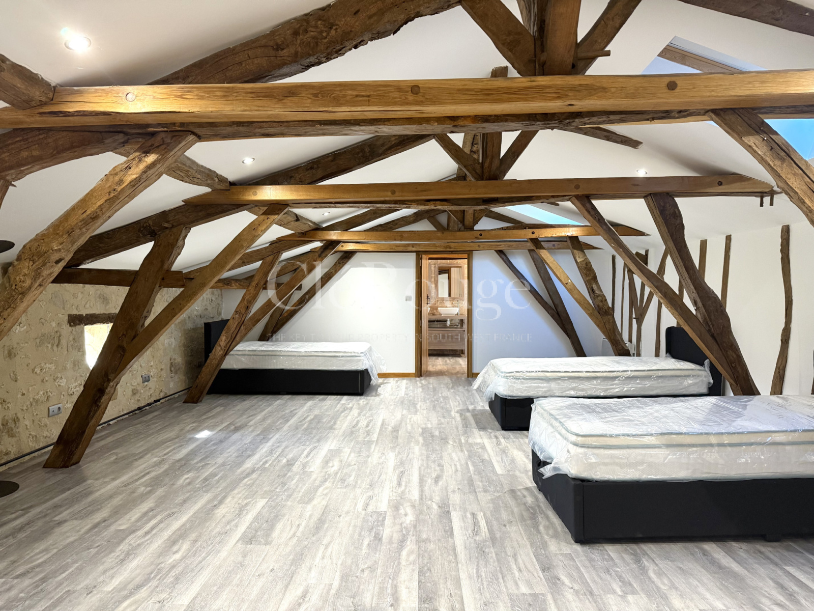 La seconde bâtisse en pierre a été divisée en trois logements indépendants. Le premier comprend une grande pièce de vie avec cuisine et salon, une chambre avec salle d’eau en rez-de-chaussée, et une vaste pièce mansardée avec poutres apparentes, actuellement utilisée comme dortoir, accompagnée d’une salle d’eau supplémentaire à l’étage.