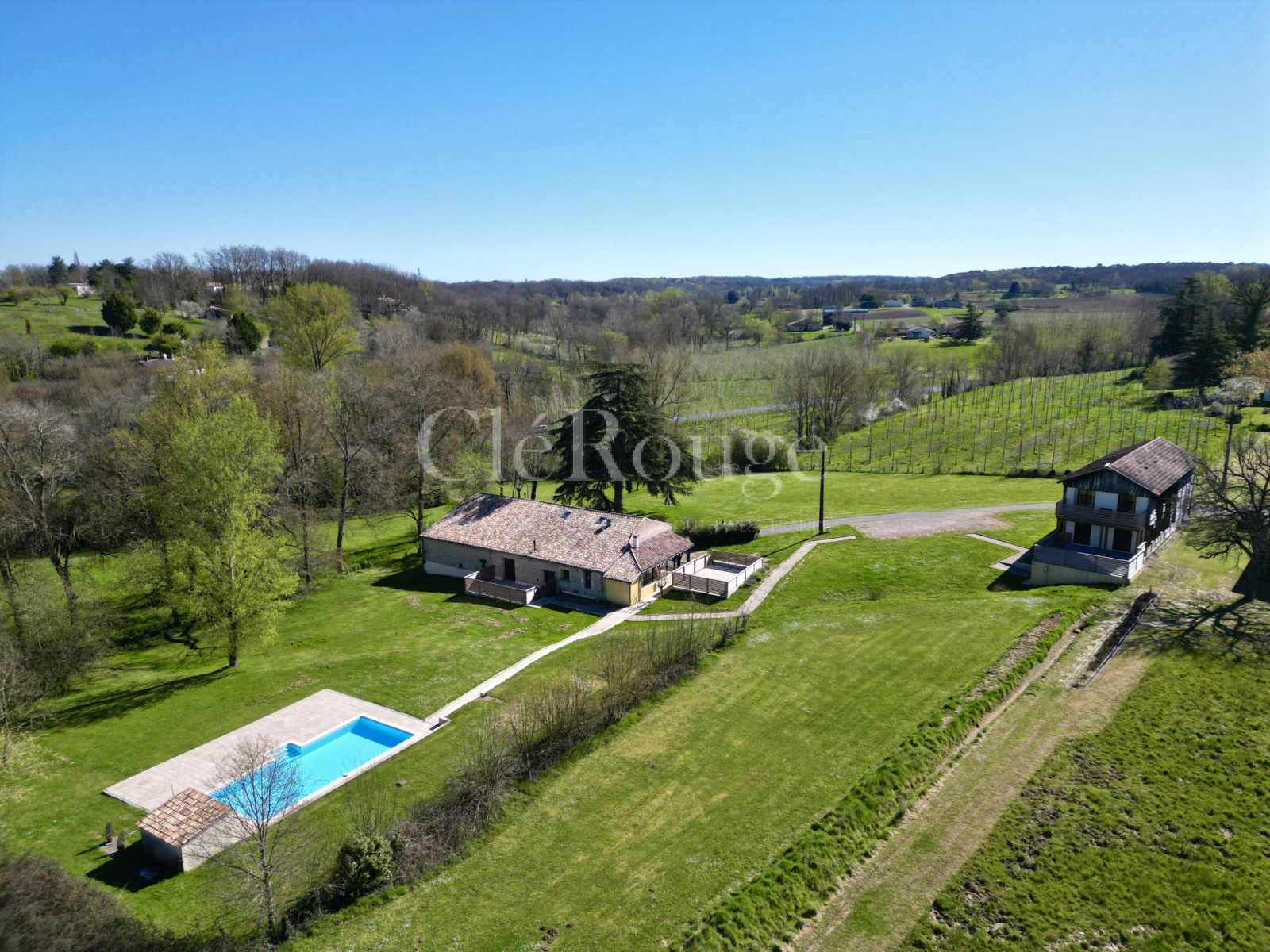 L’ensemble est implanté sur un terrain de près de 2 hectares, agrémenté d’une piscine avec pool house, dans un environnement verdoyant.