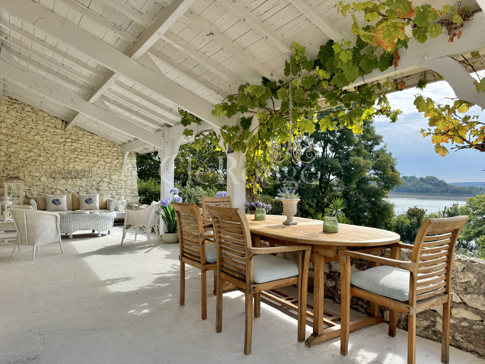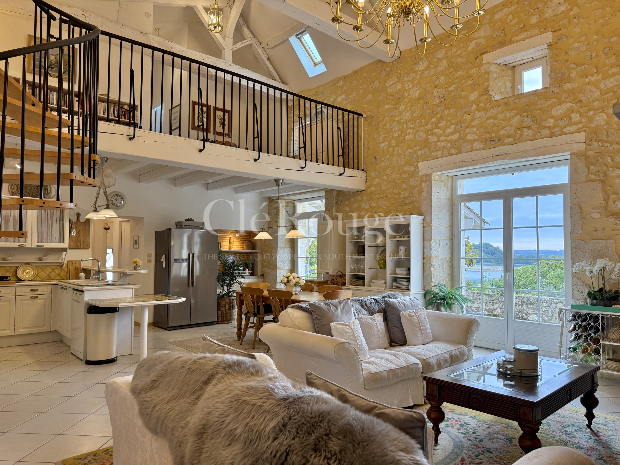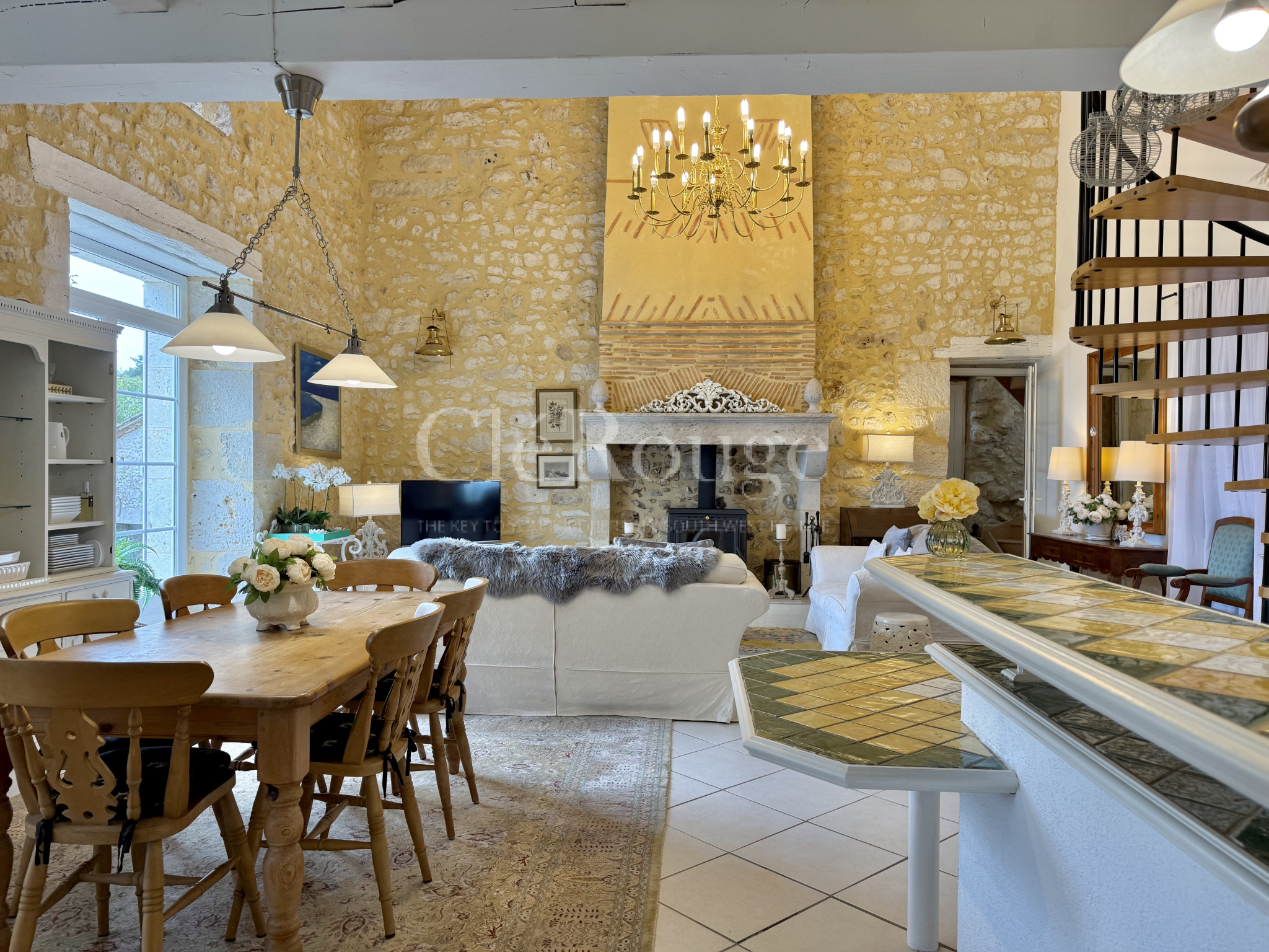 Rénovée avec goût, la propriété offre de beaux volumes baignés de lumière. L’entrée se fait par un hall ouvrant sur un vaste salon/salle à manger aux murs en pierre apparente, avec cheminée monumentale et poutres blanches, créant une atmosphère à la fois conviviale et élégante.