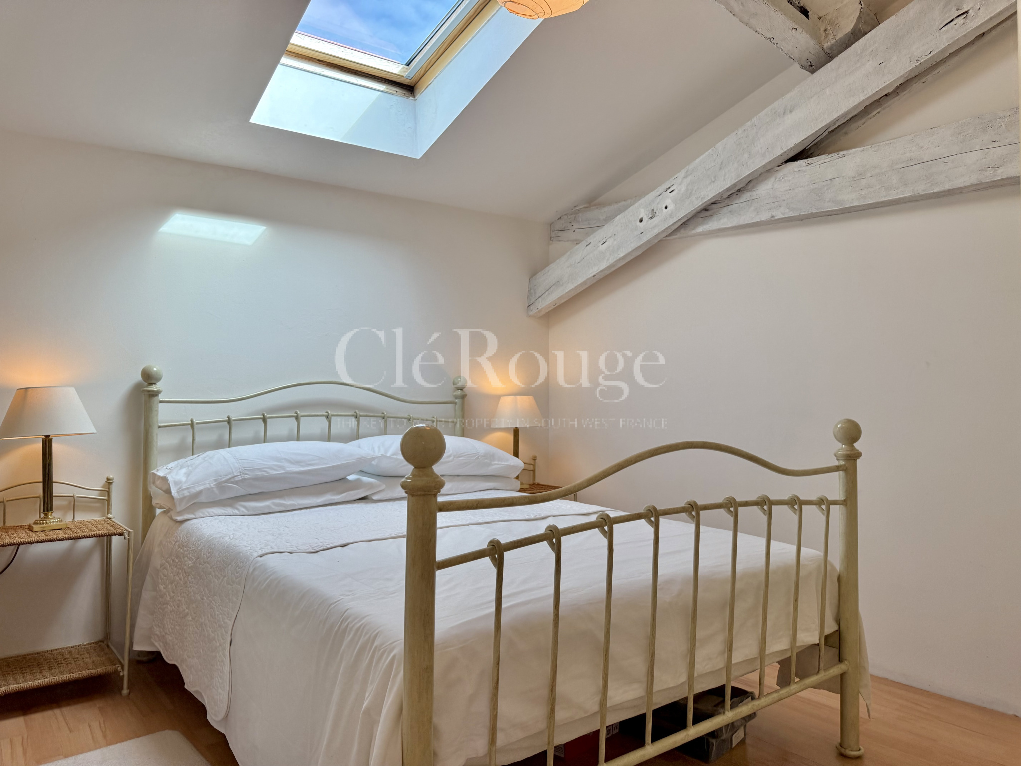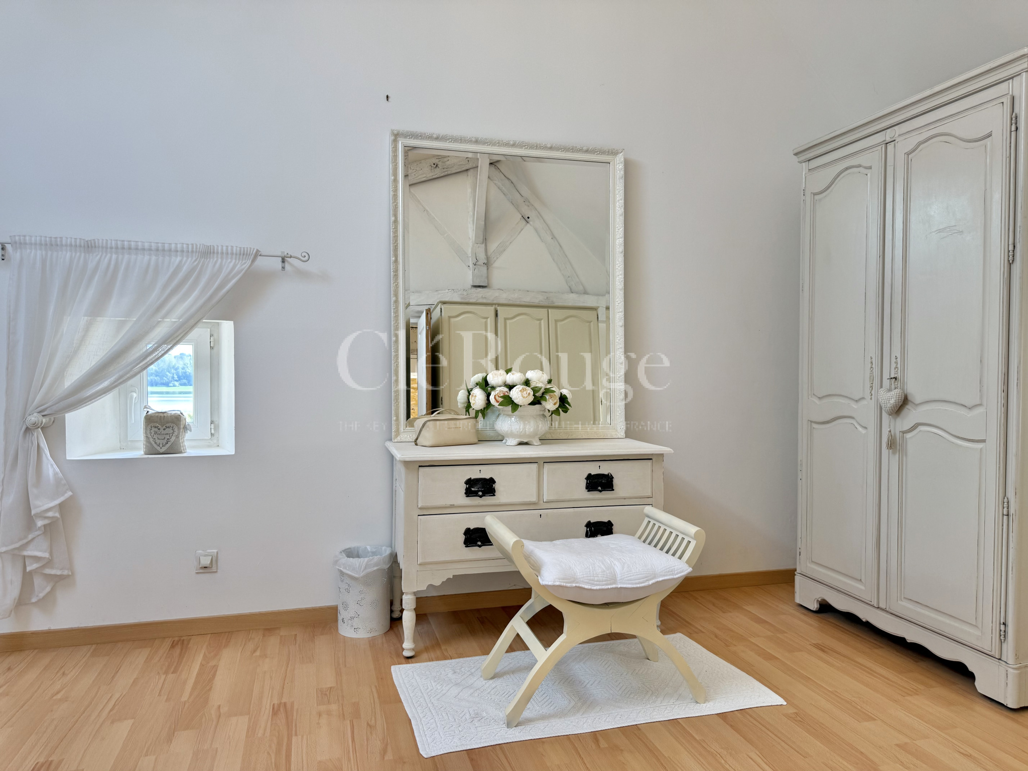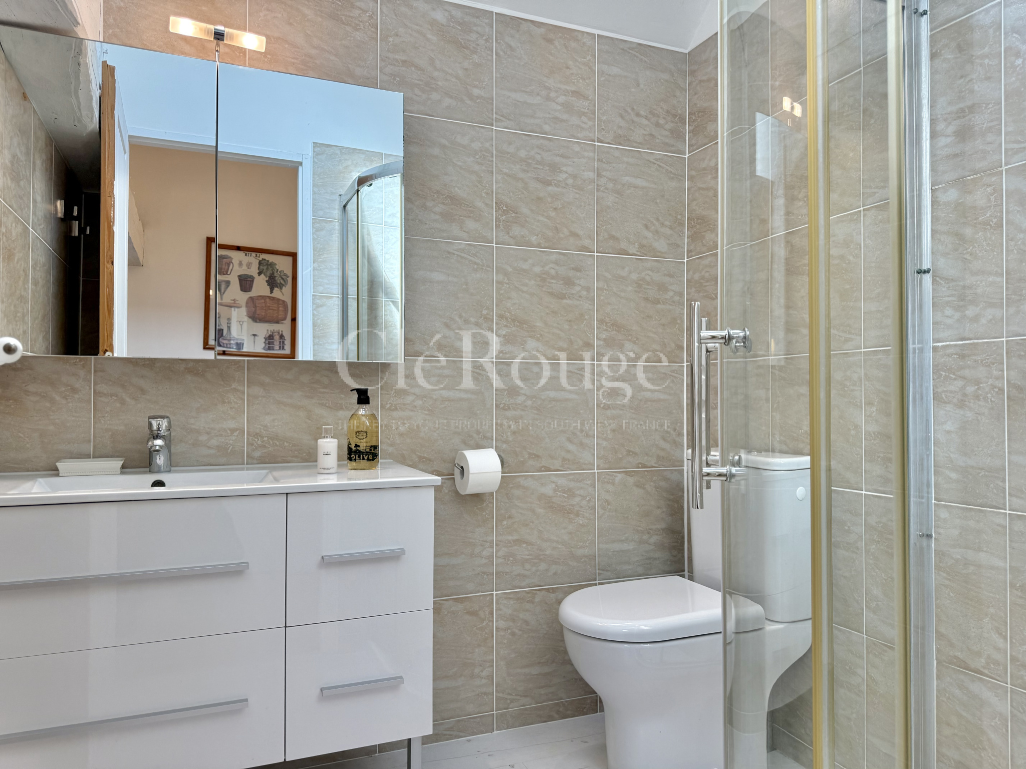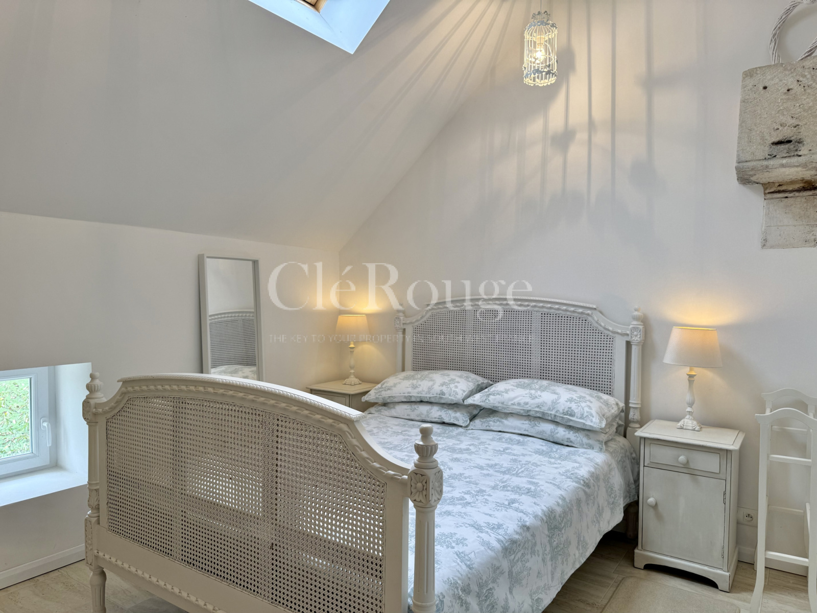 Un autre escalier indépendant mène à une chambre supplémentaire avec salle d’eau attenante, idéale pour recevoir famille ou amis en toute intimité.
