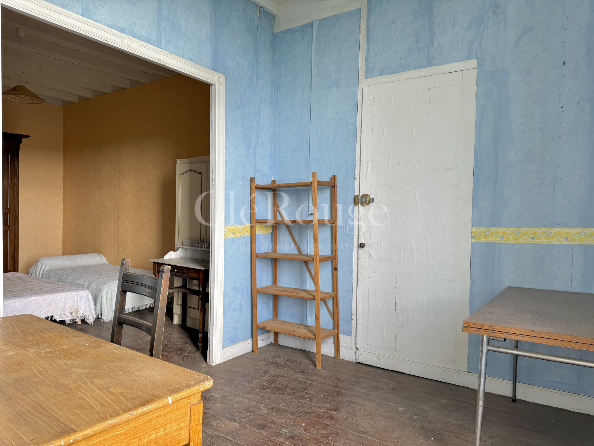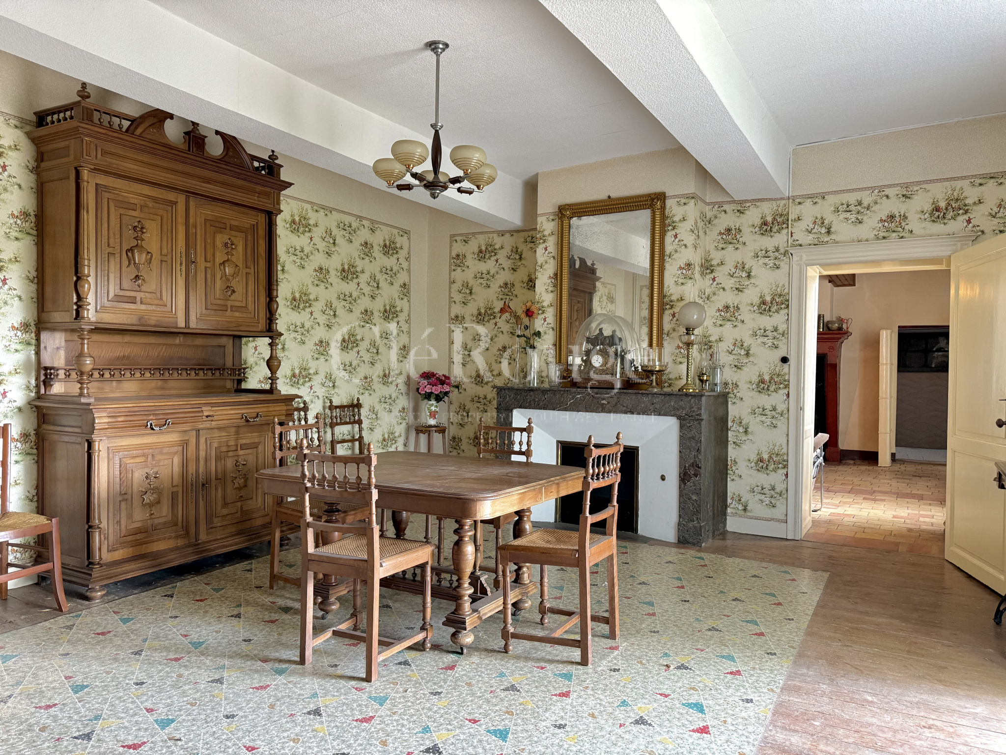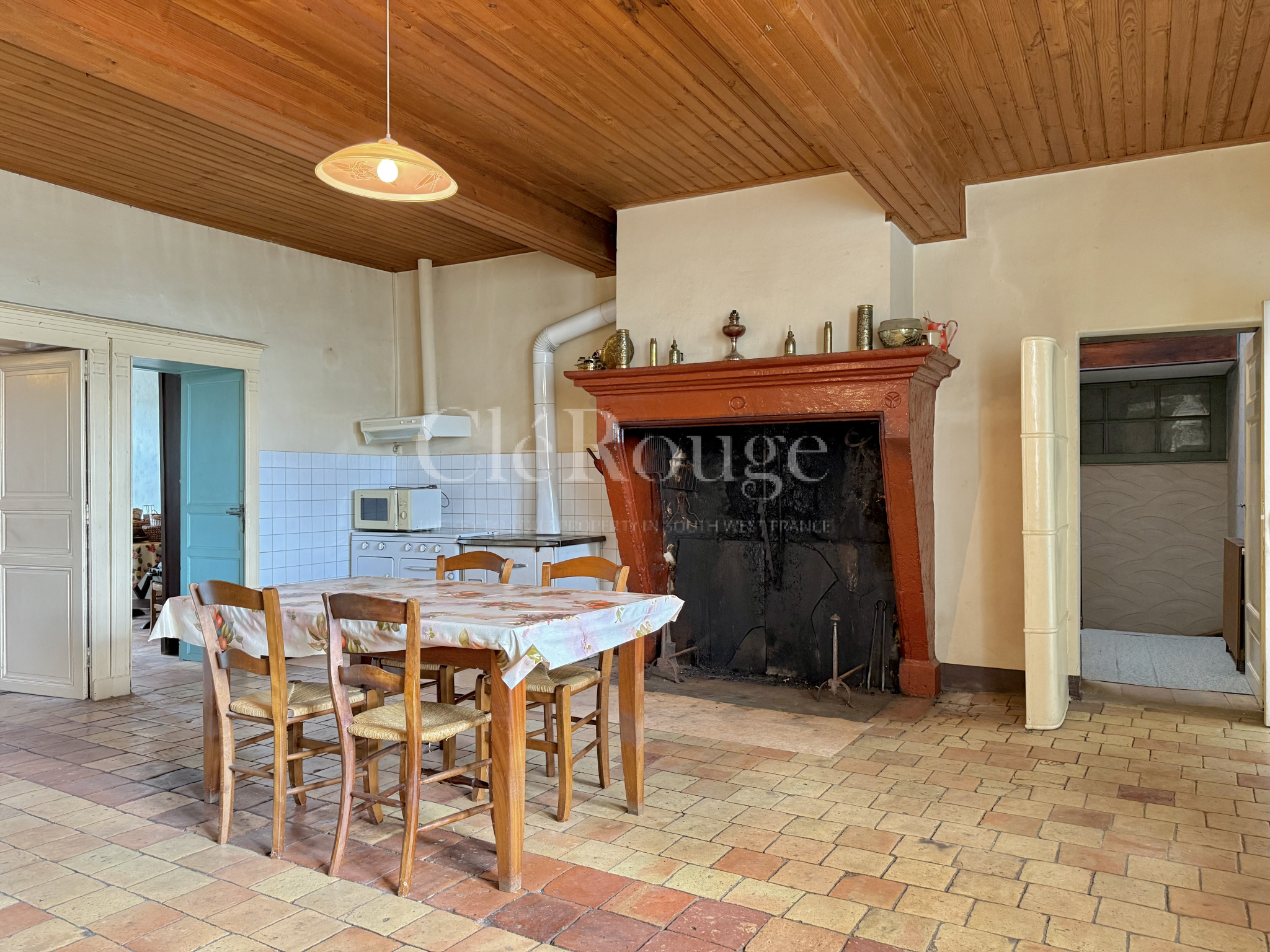 La maison principale dispose de trois pièces de réception en enfilade : une salle à manger avec sa cheminée d’époque, un salon actuellement utilisé comme chambre et une cuisine. Une arrière-cuisine, deux chambres et un bureau complètent le rez-de-chaussée.
