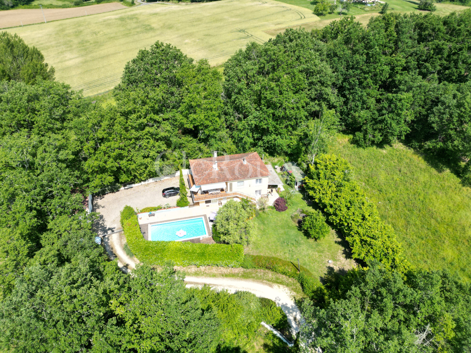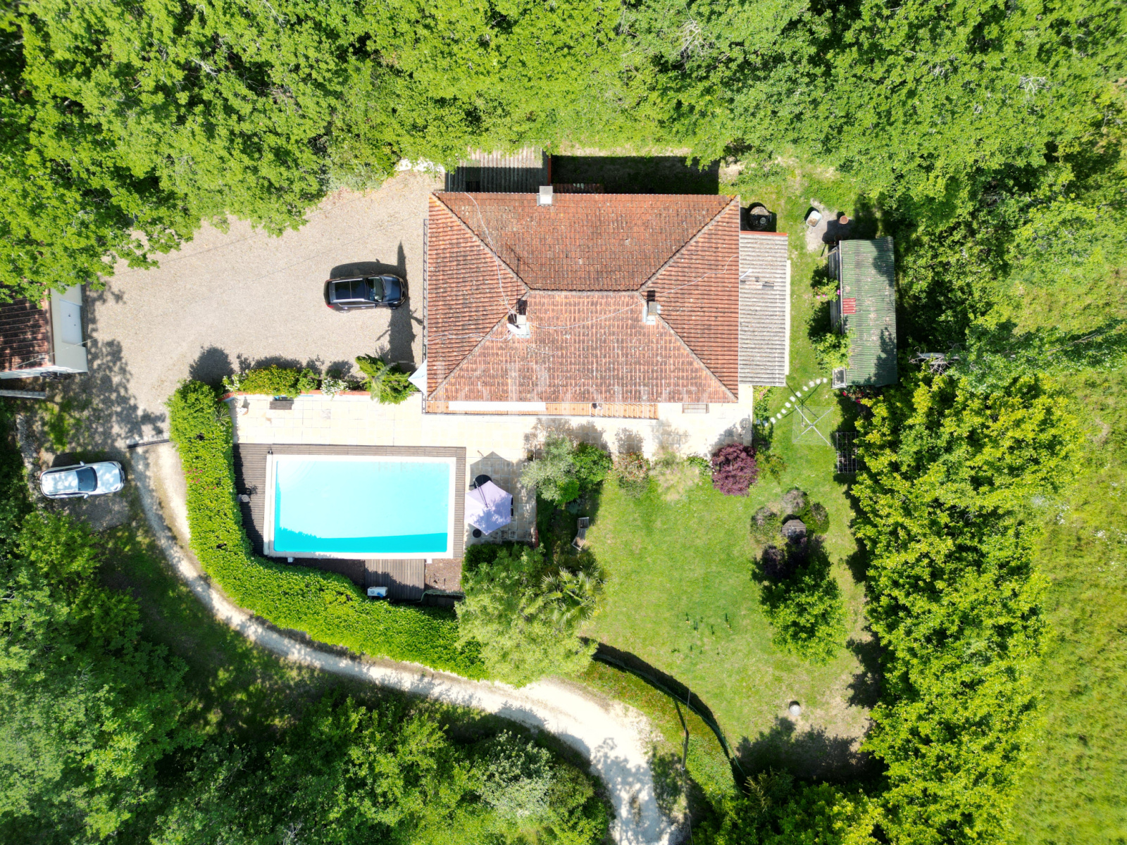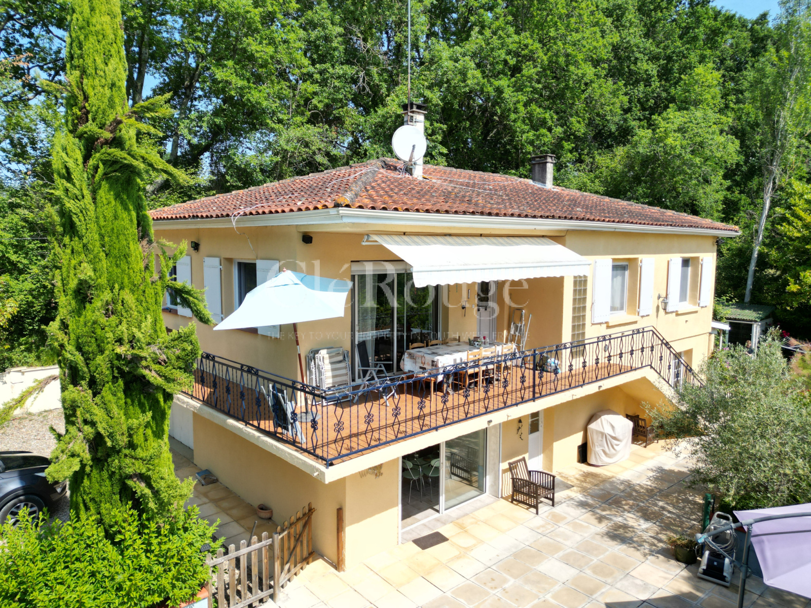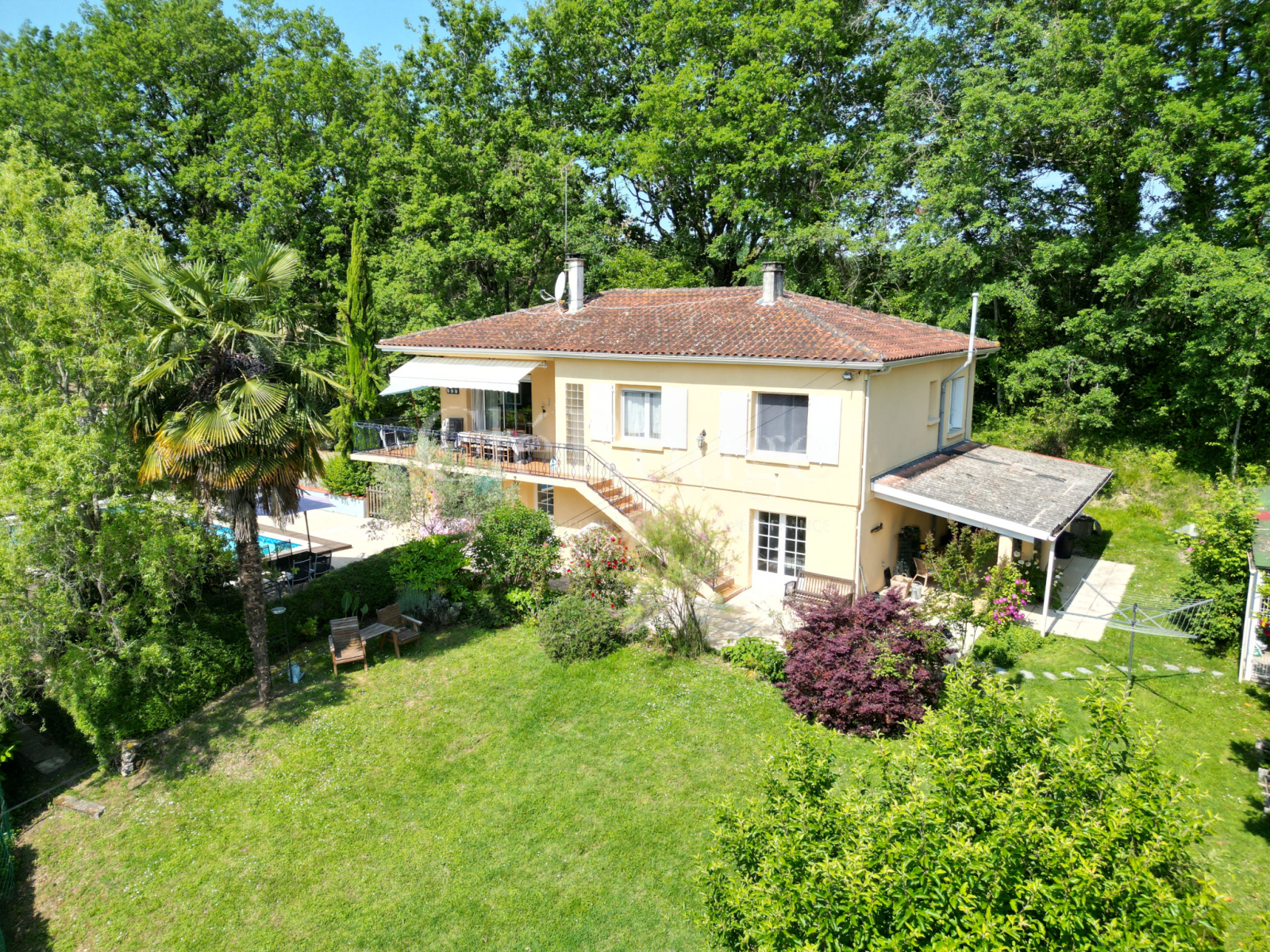 La maison se compose d'un hall d'entrée, salon / salle à manger avec des portes-fenêtres qui mènent à un balcon enveloppant extérieur, parfait pour manger toute l'année; Chauffage central au fuel; Poele à bois dans le salon; Cuisine (équipée); Buanderie, trois chambres doubles; buanderie; Salle de bain avec douche à l'italienne spacieuse; Un escalier depuis le couloir mène à l'appartement indépendant avec hall d'entrée, cuisine ouverte / salon / salle à manger ouvrant sur la piscine, 2 chambres, une salle de douche et un buanderie. Sur ce niveau, il y a aussi un garage intégral double longueur. EXTÉRIEUR: Double garage et un système de drainage septique nouvellement installé. Jardins bien entretenus; Grand niche à chien; Piscine 10 x 5 (chauffée); Situé à proximité de la ville-château de Duras, à 48 km de Bergerac et à 79 km de Bordeaux.