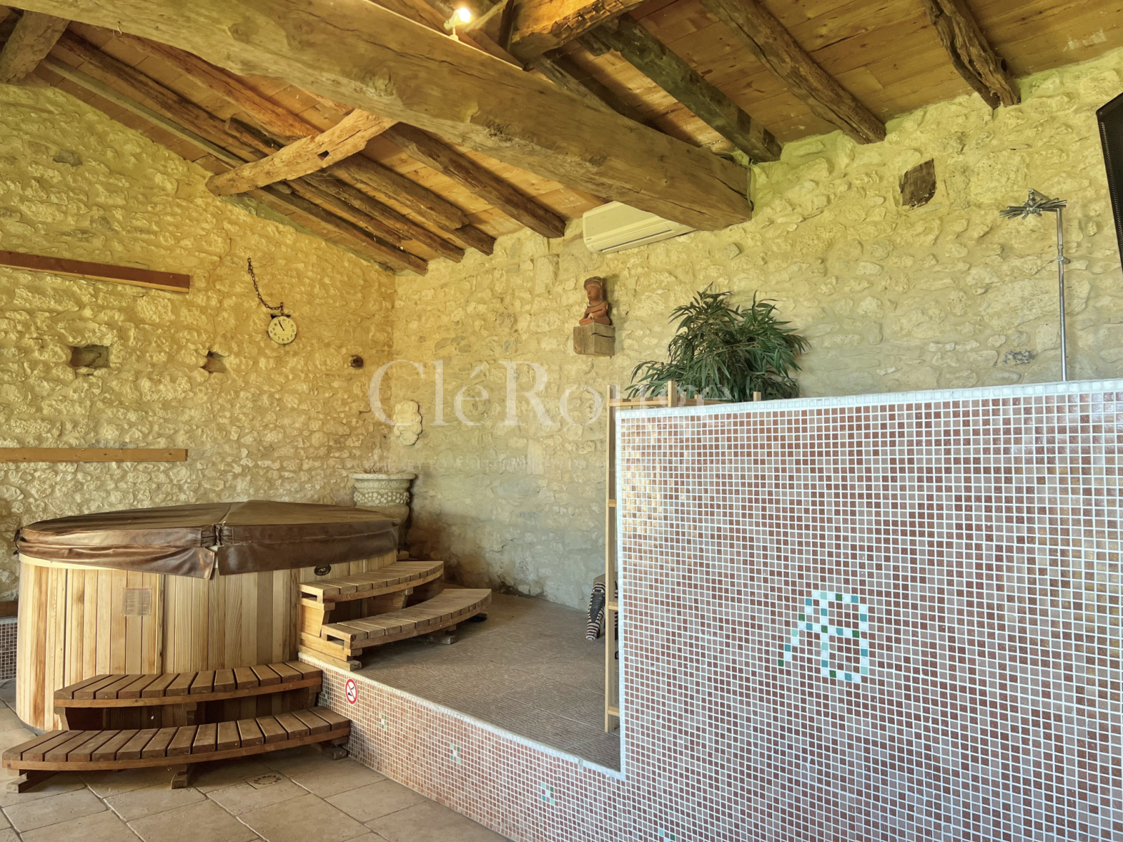 Une dépendance a été aménagée en espace bien-être, équipée d’un jacuzzi, d’un sauna, ainsi que d'une douche.