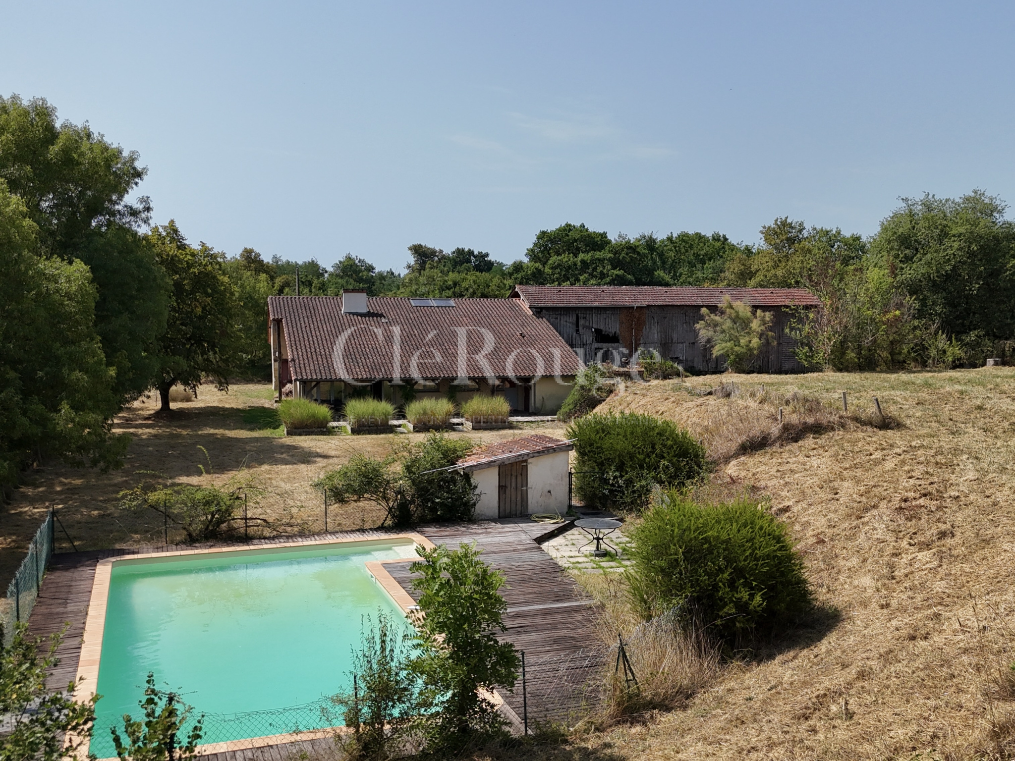 À l’extérieur, vous profiterez d’un grand séchoir actuellement utilisé comme garage, d’une piscine avec terrasse et d’un terrain de près de 7 hectares, dont une grande partie boisée agrémentée de cabanes.