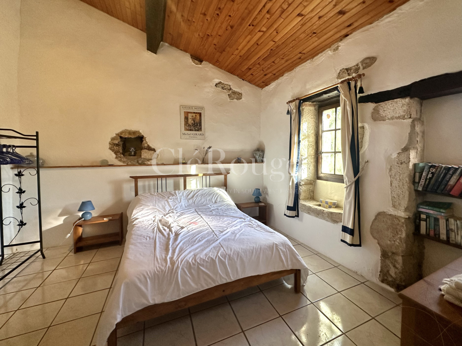 Le terrain de 1735m2, avec piscine et entouré d'une végétation soignée, comprend également une ruine d'ancienne maison en pierre avec sa cheminée, ajoutant un élément de caractère à la propriété.