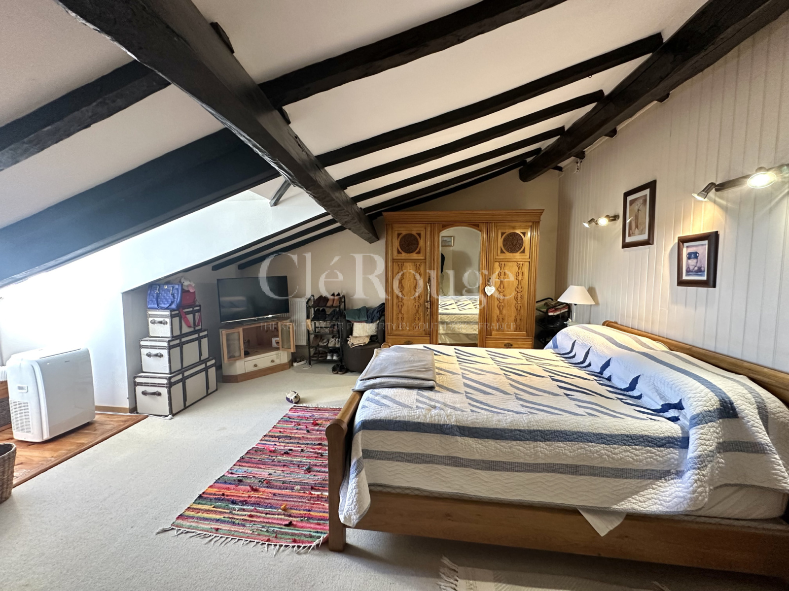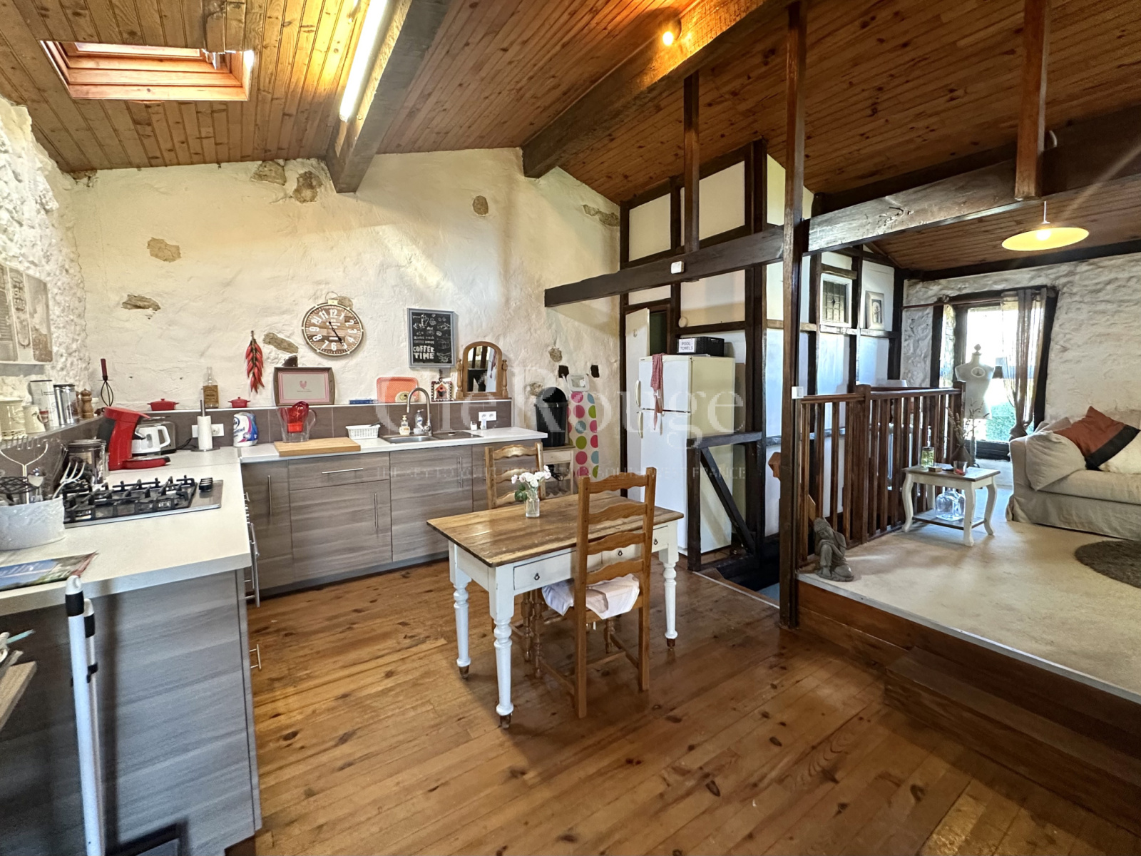 Une terrasse couverte à l'entrée de la maison principale ouvre sur la piscine, invitant à la détente. Le rez-de-chaussée est aménagé avec une cuisine ouverte sur la salle à manger, un salon, une autre salle à manger pouvant être une chambre, une salle d'eau et un atelier/garage. À l'étage, on trouve 3 chambres, une salle d'eau et un bureau.