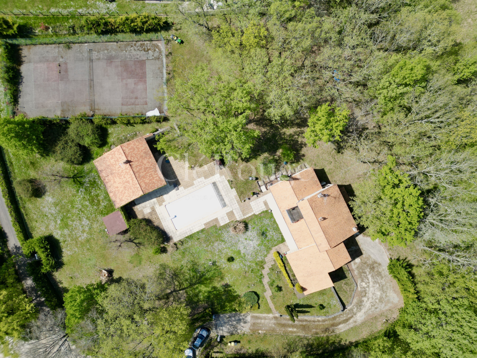 À l’extérieur, un grand studio très lumineux, déjà équipé d’une salle d’eau, pourrait facilement être transformé en habitation indépendante. La propriété dispose également d’une superbe piscine avec couverture intégrée, d’un terrain de tennis privé et d’une zone boisée, offrant un environnement naturel et préservé.