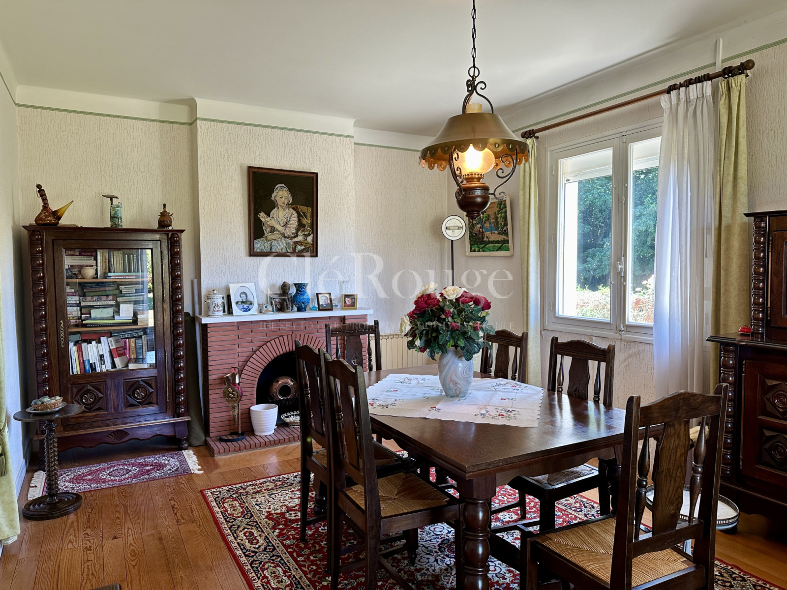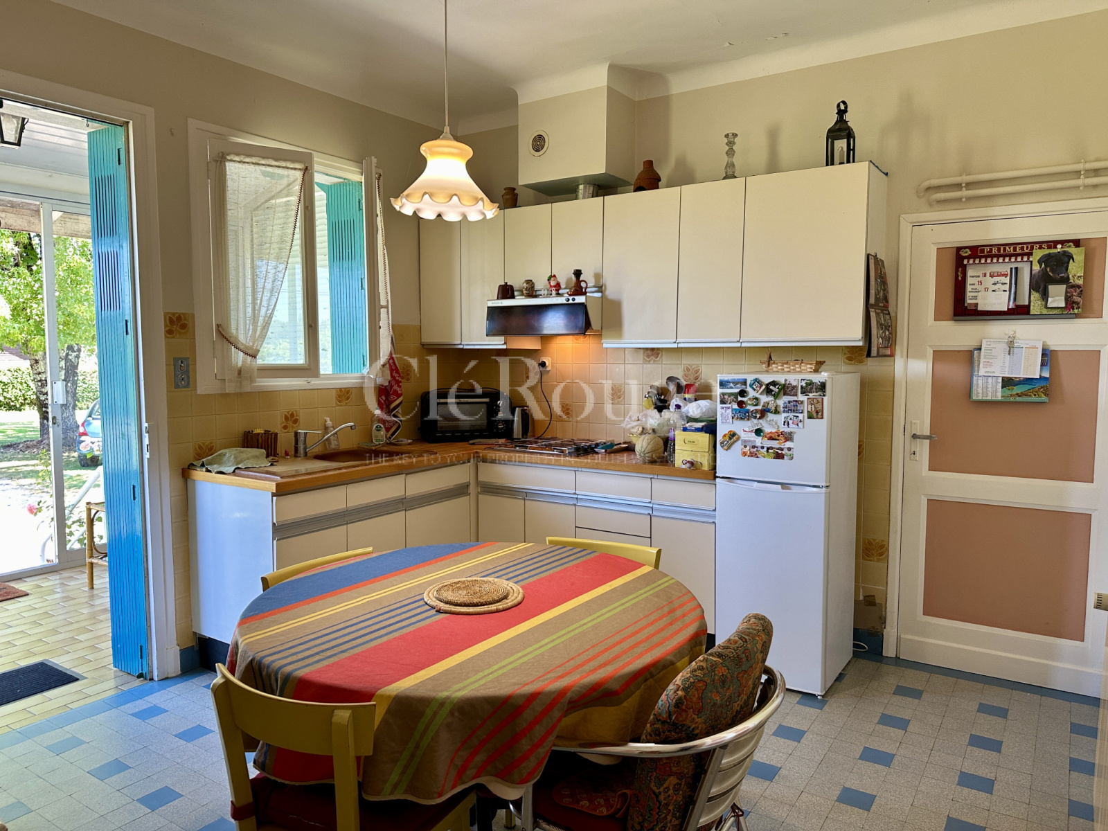 À l'intérieur, la cuisine lumineuse s'ouvre sur une véranda, idéale pour des repas en toute saison. Le salon, chaleureux avec sa cheminée, offre une vue dégagée sur les champs, créant une ambiance conviviale.