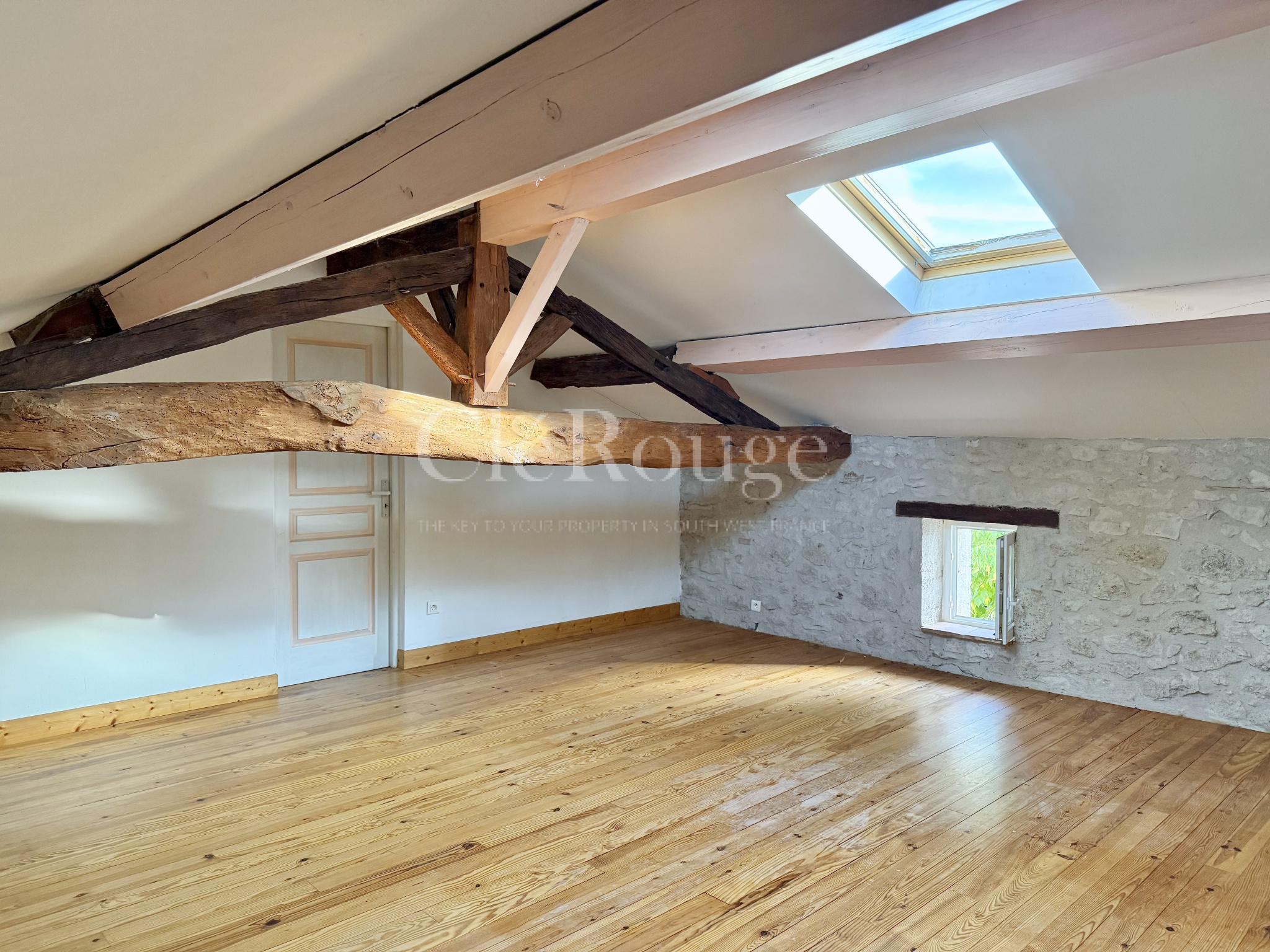 Une chambre mansardée, particulièrement charmante, met en valeur de belles poutres apparentes anciennes qui lui confèrent une atmosphère chaleureuse et intime.