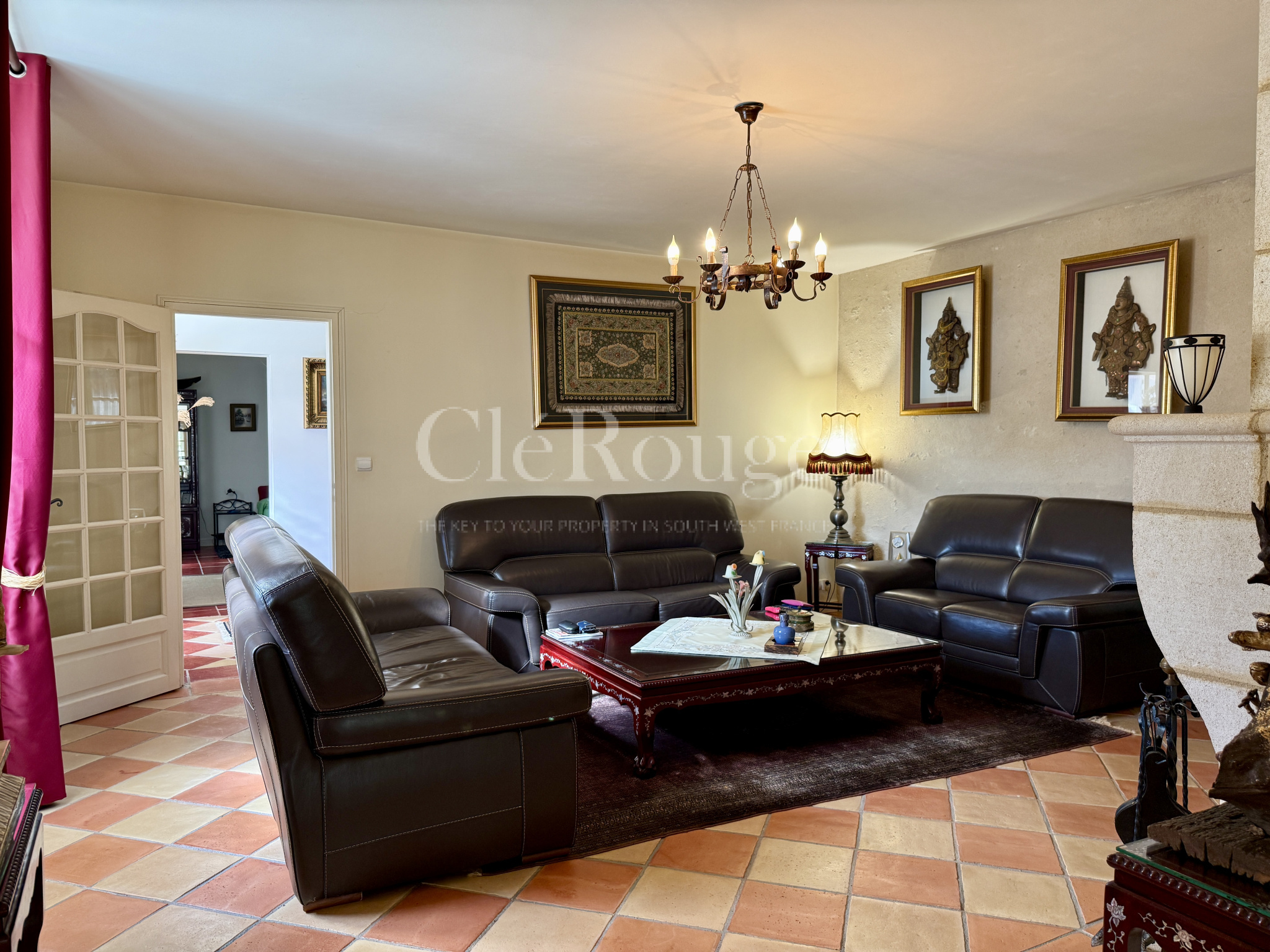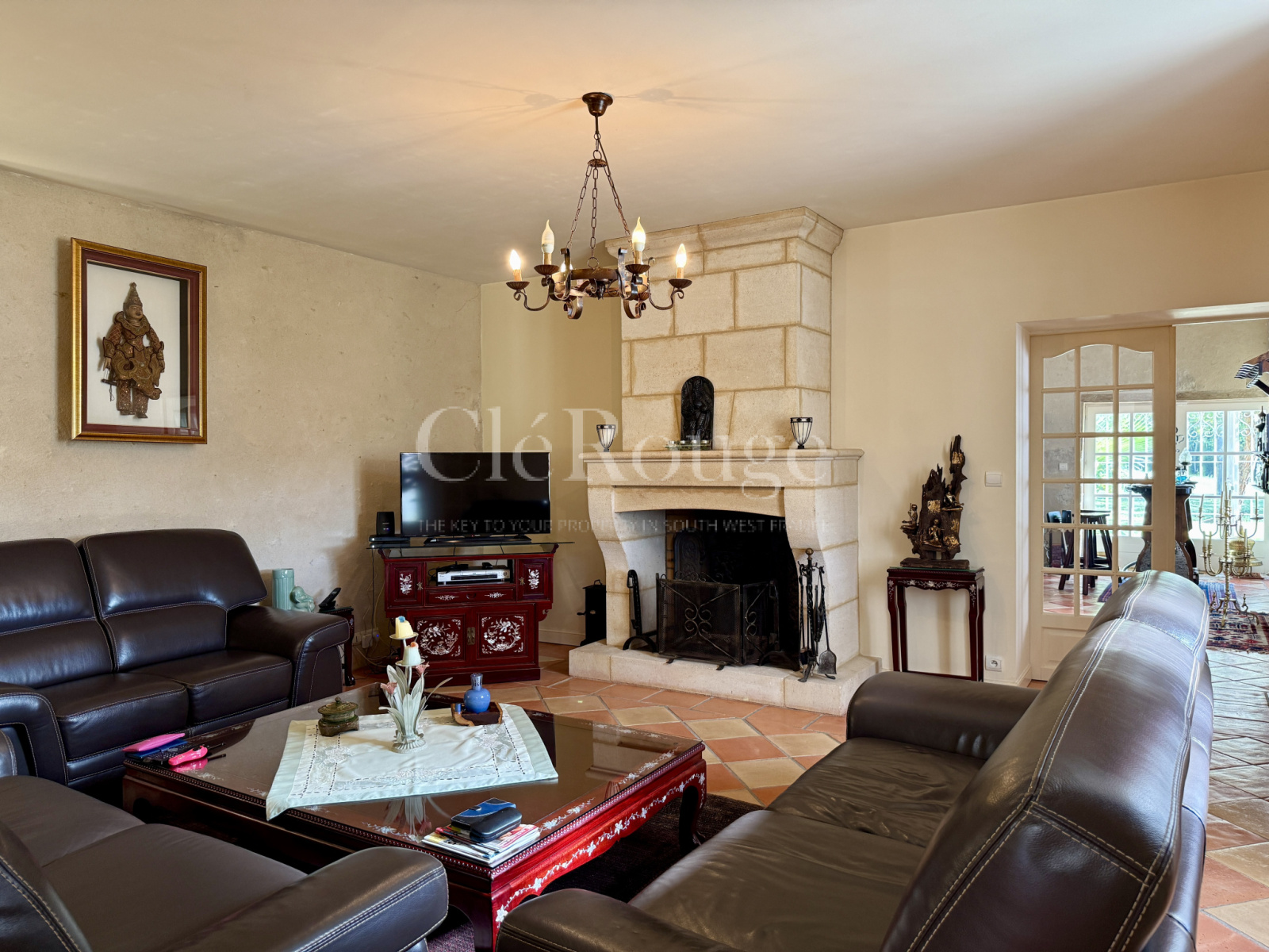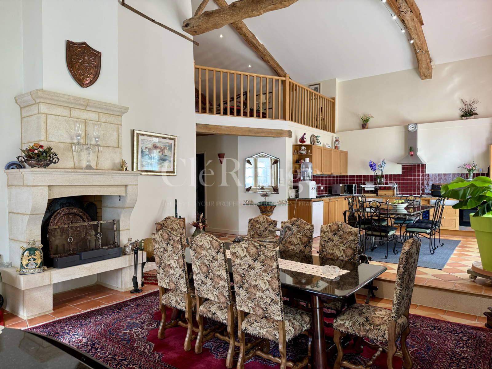 Au rez-de-chaussée, une grande cuisine équipée ouverte sur la salle à manger avec une cheminée imposante offrent un espace de vie des plus agréables. De plus sa belle hauteur sous plafond fait de cette grande pièce une pièce aéré avec beaucoup de charme. Un bureau est également disponible ainsi qu’une buanderie/chaufferie. Un salon qui est complété par une cheminée identique à celle de la salle à manger. On retrouve aussi une suite parentale qui est située à côté de la belle véranda d’environ 50 m2.