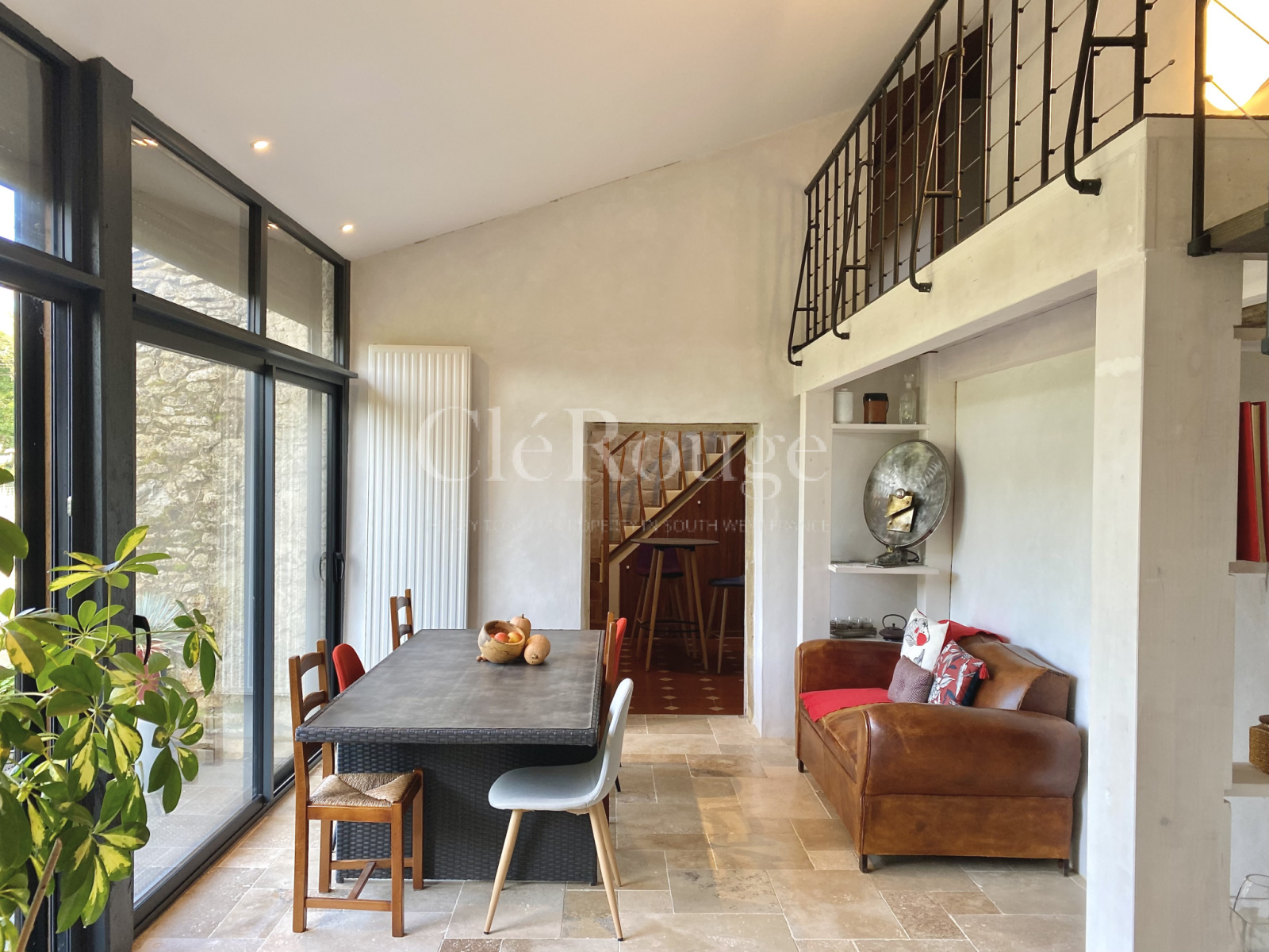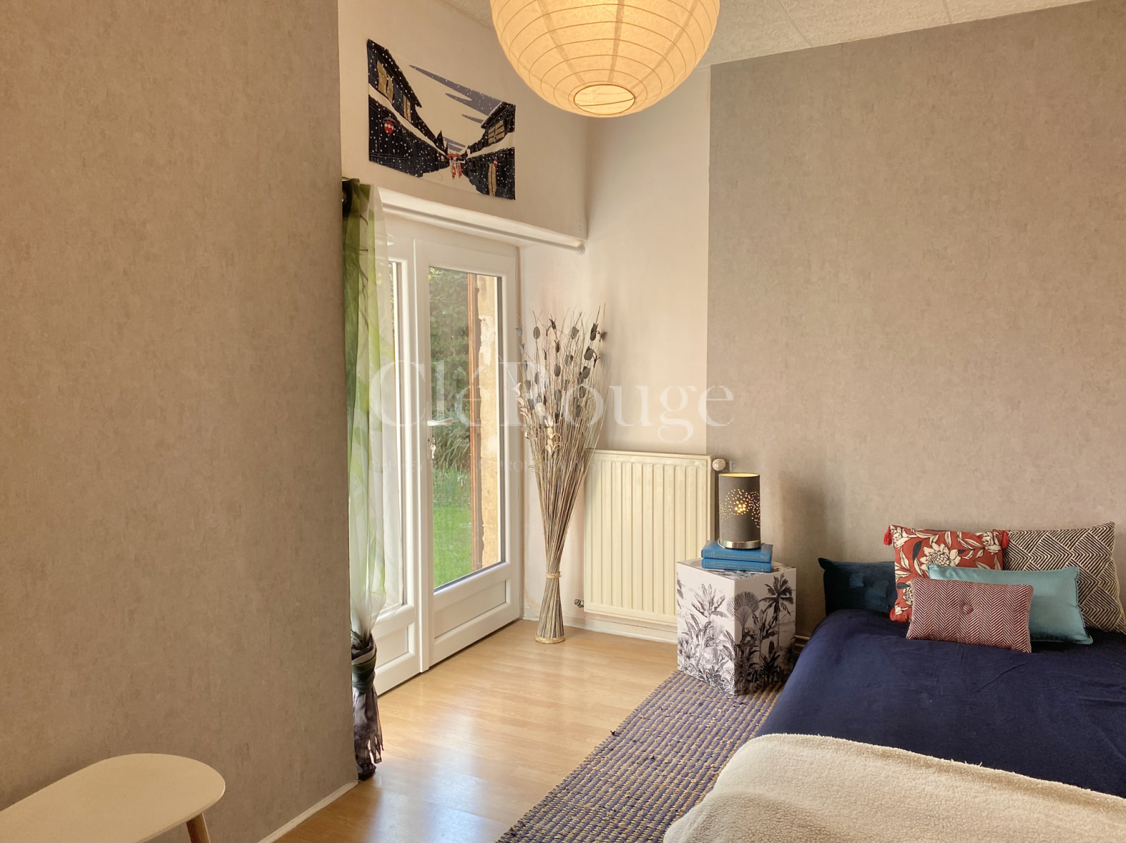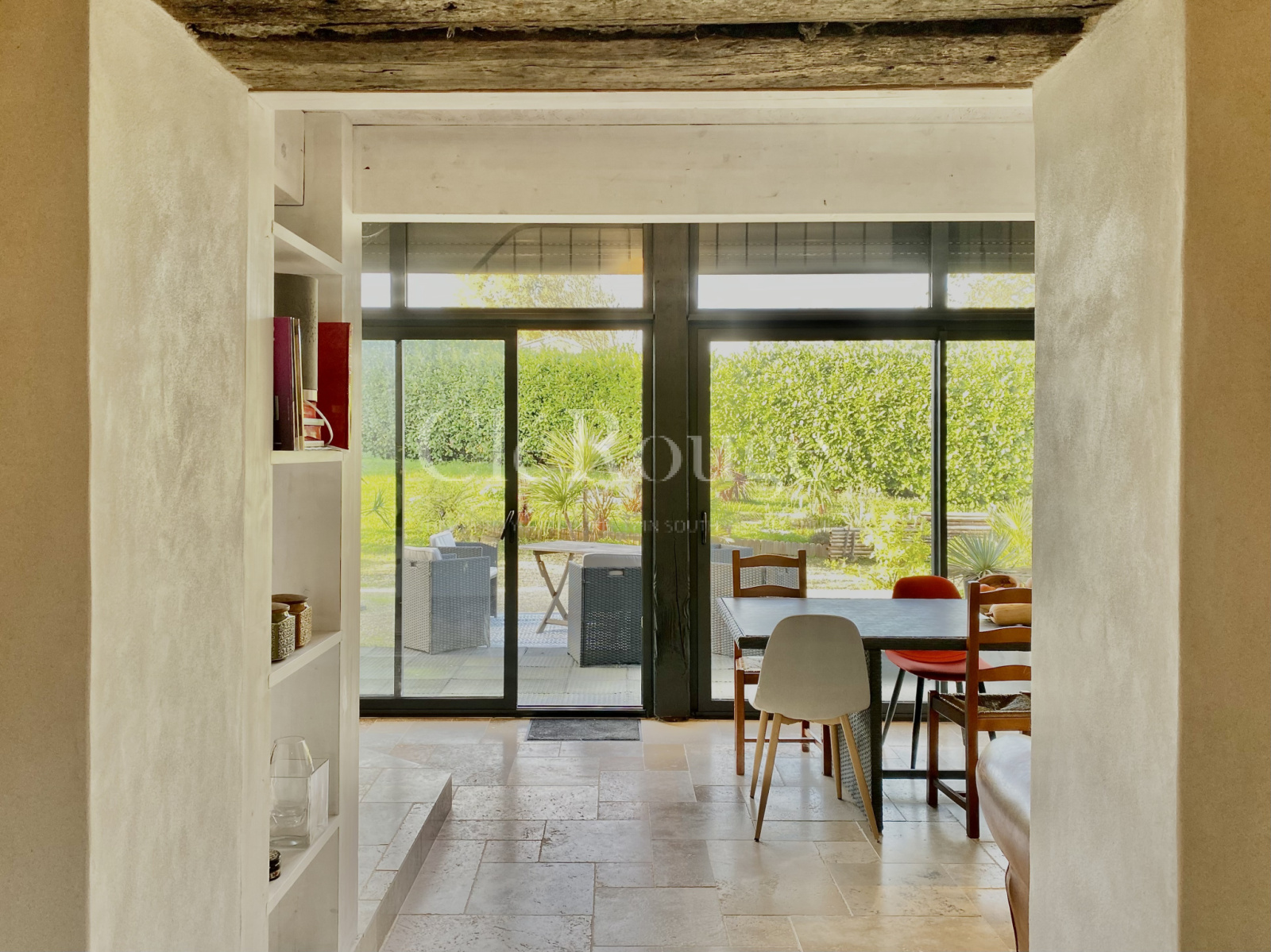 Elle possède une cuisine équipée très récente, une salle à manger baignée de lumière grâce à de larges et hautes baies vitrées, offrant une vue ouverte sur le jardin, ainsi qu'un salon cosy avec une magnifique cheminée ancienne dotée d'un insert.