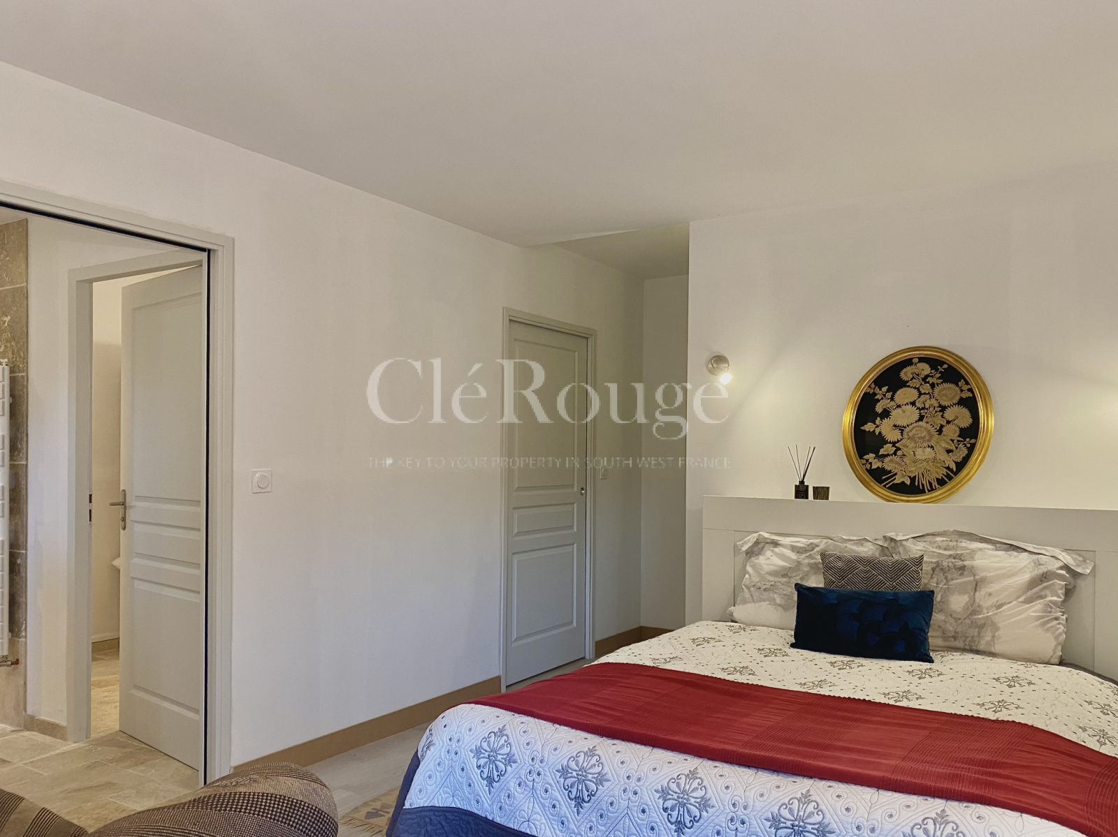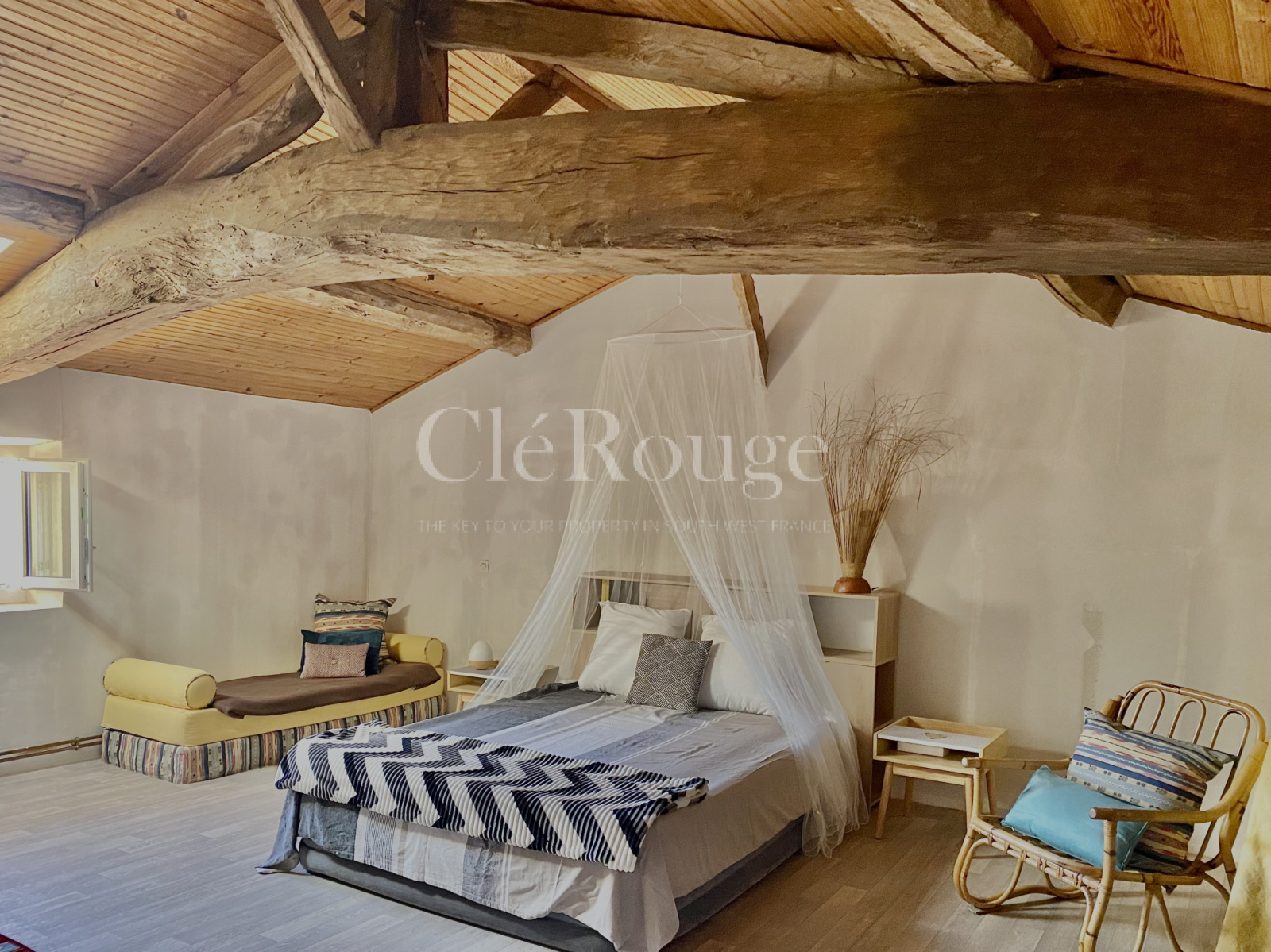 La maison dispose de 6 chambres aux généreux volumes, agrémentées de poutres apparentes ou de murs en pierre pour certaines, dont une suite parente avec dressing et salle d'eau attenants.