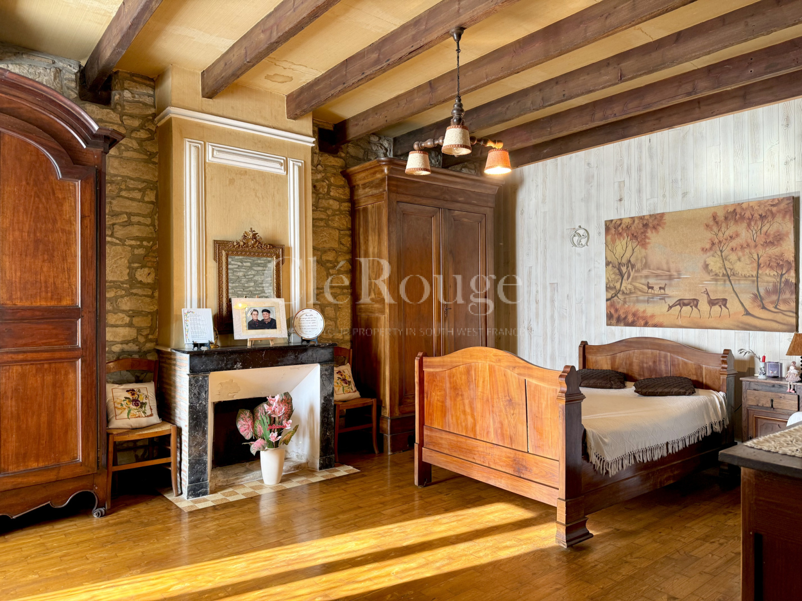 La propriété comprend également un grand garage ainsi qu’une vaste grange dont les volumes permettent de nombreux aménagements selon les besoins. L’ensemble est implanté sur un terrain de 5 hectares, alternant prairies et zones boisées, et constitue un cadre calme et naturel, à proximité des commodités.
