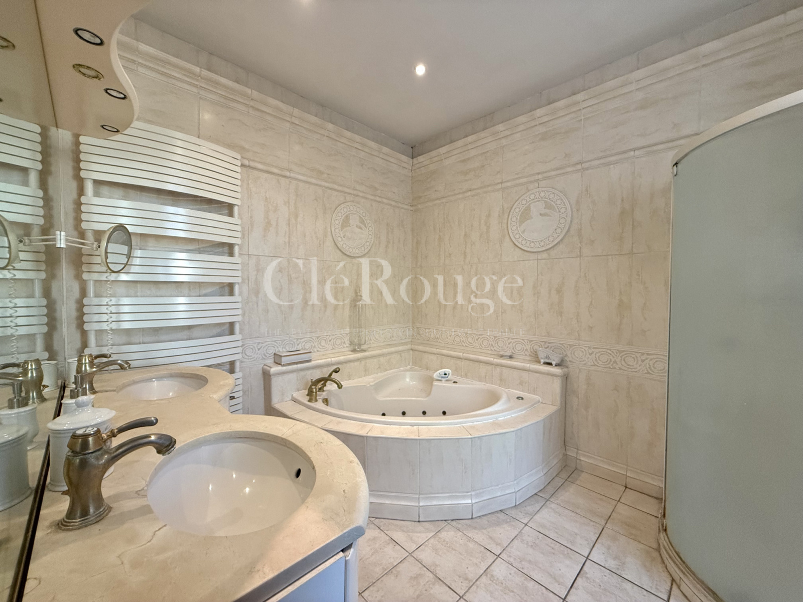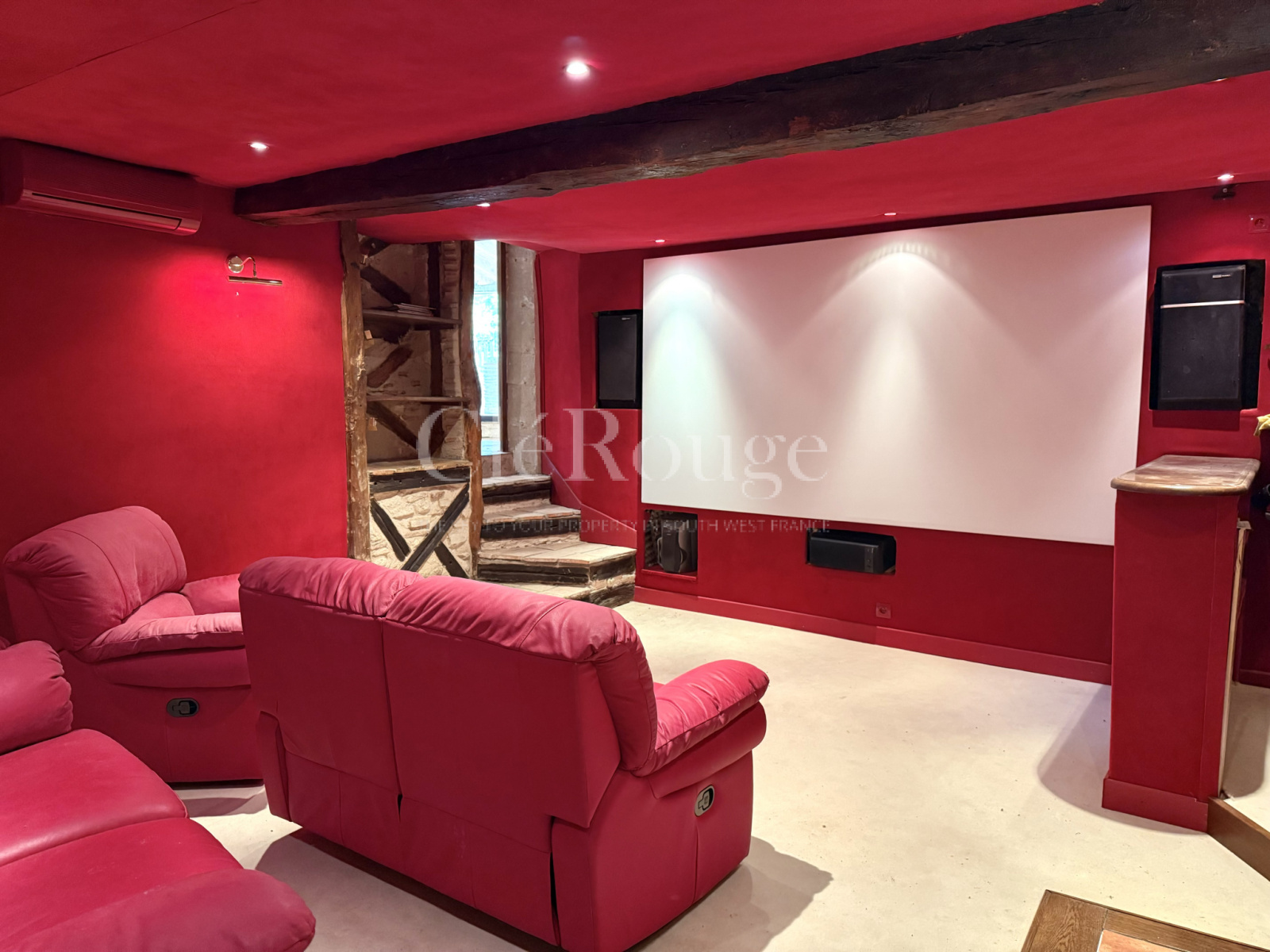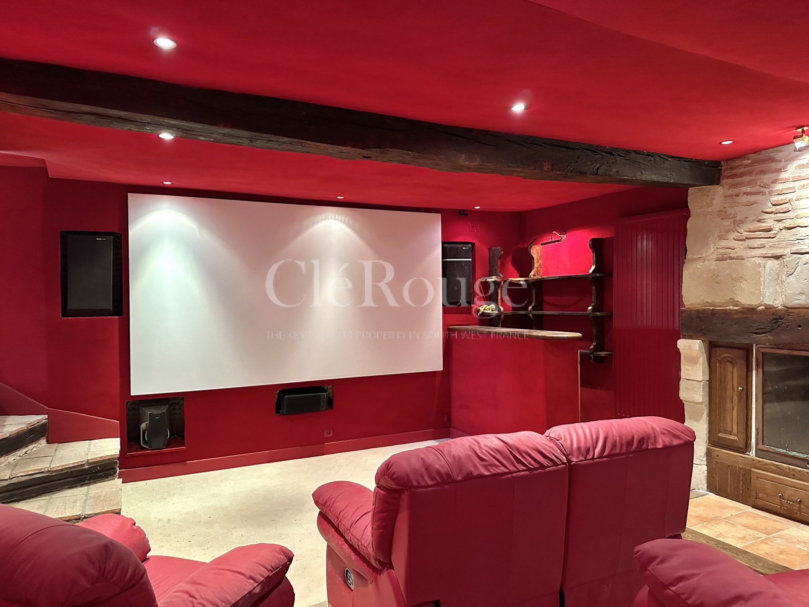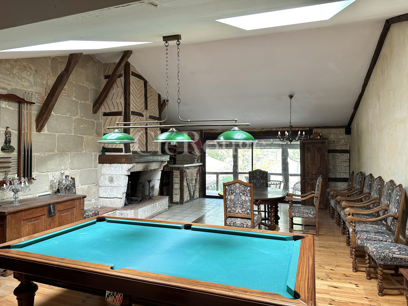 La dépendance, à rénover, dispose déjà de pièces aménagées pour le divertissement, avec un grand salon agrémenté d’un billard, deux chambres et une salle de cinéma. Deux balcons, accessibles depuis le salon-billard et une autre pièce, prolongent l’espace et offrent une vue charmante sur le jardin.