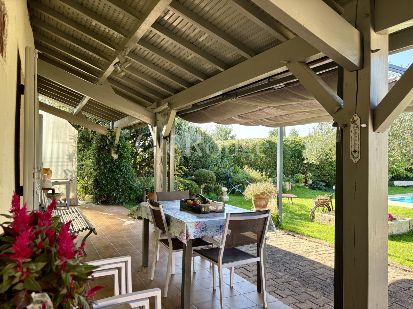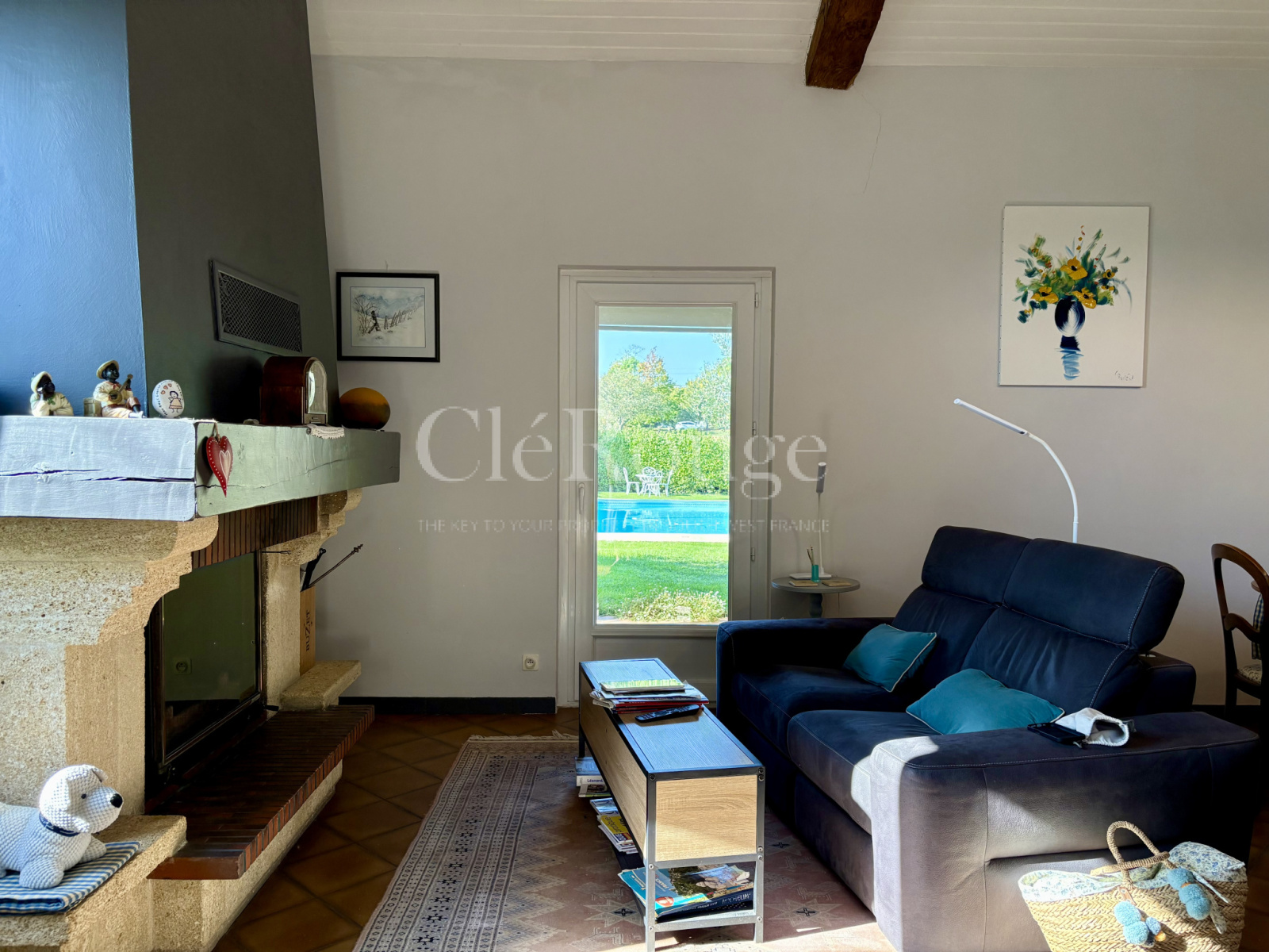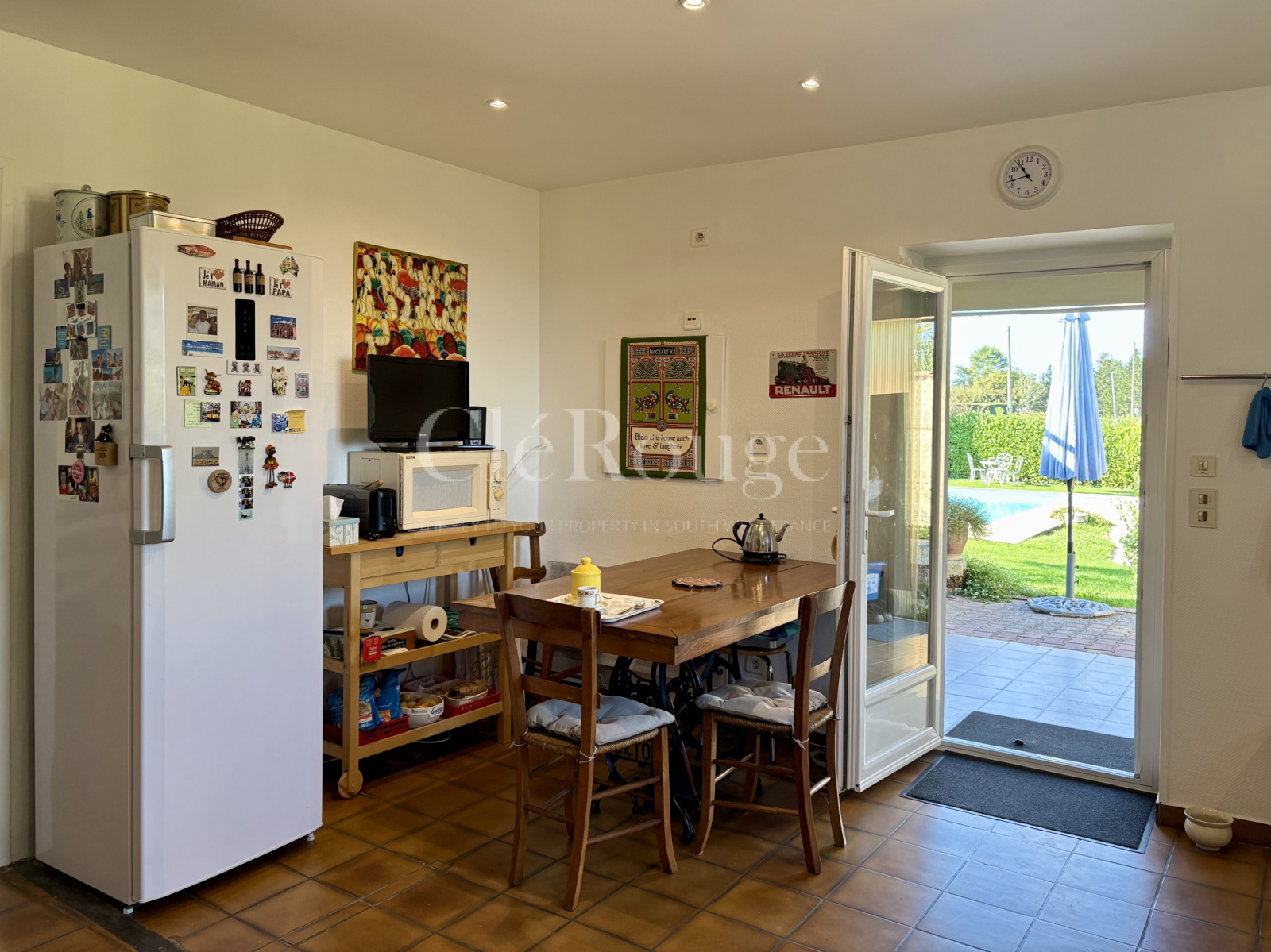 Elle dispose de quatre chambres de belle taille, idéales pour accueillir famille et amis dans une atmosphère chaleureuse. Les pièces de vie spacieuses, la cuisine et le salon, s’ouvrent directement sur la terrasse ensoleillée et la piscine, créant une agréable continuité entre intérieur et extérieur. Une terrasse couverte permet également de profiter pleinement des journées d’été et des soirées douces, à l’abri du soleil.