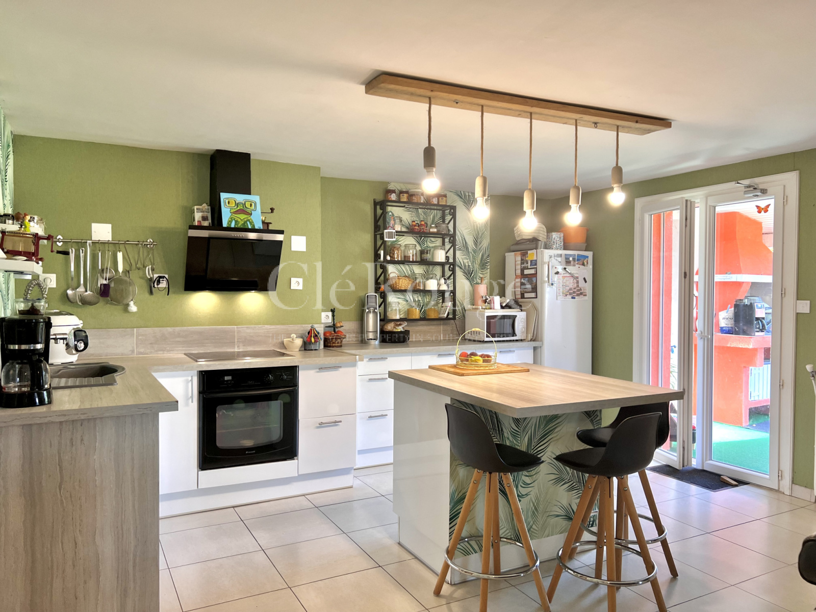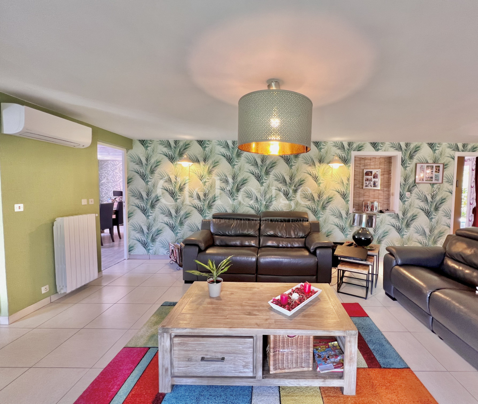 Ce grand espace de vie chaleureux et confortable donne sur une terrasse couverte offrant un espace idéal pour des repas en plein air ou des moments de détente tout en admirant la vue magnifique sur le paysage.