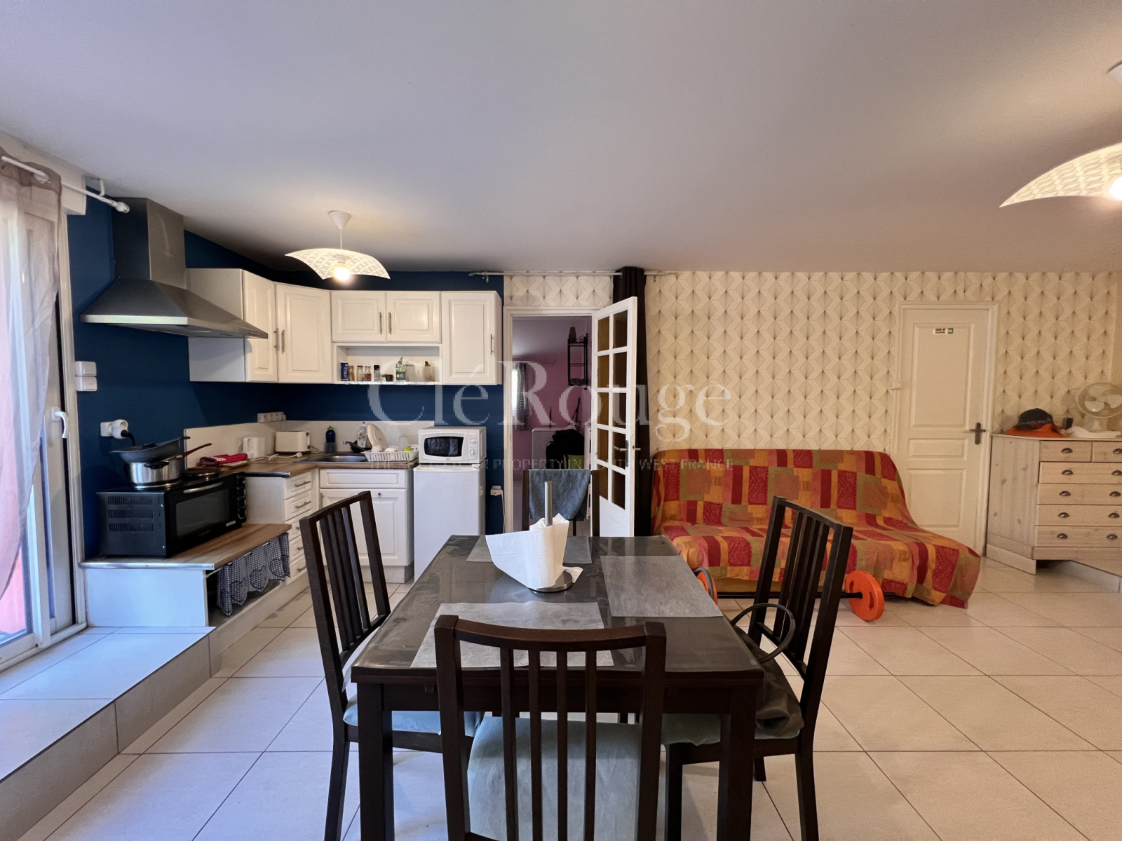 L'entrée se fait par un joli jardin menant au hall d'entrée desservant une chambre, une salle d'eau, un w.c et un grand séjour/cuisine.