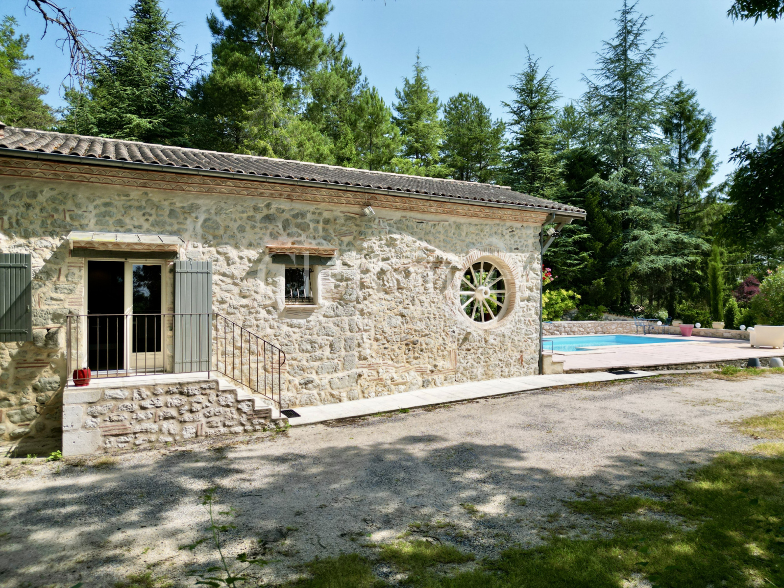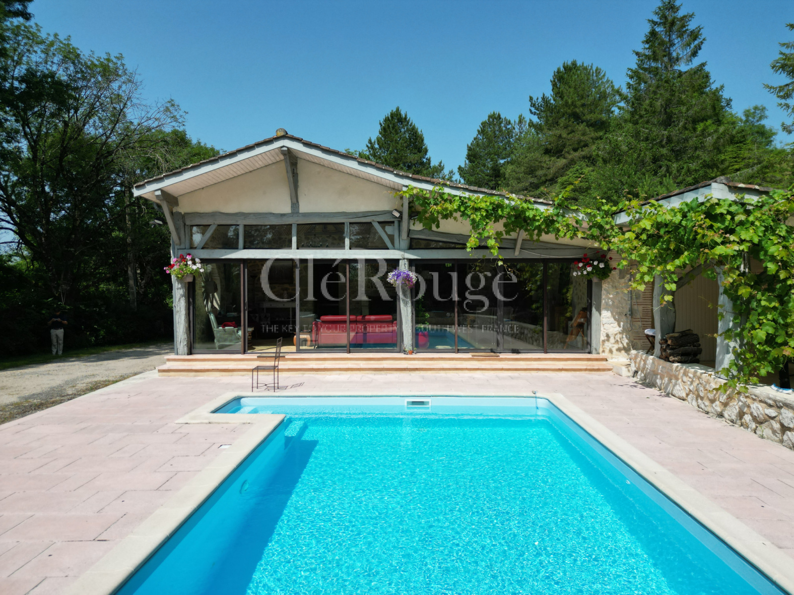 À l’extérieur, la piscine de 8x4 mètres s’intègre harmonieusement au paysage, entourée de terrasses et d’espaces aménagés pour profiter pleinement de la nature environnante.