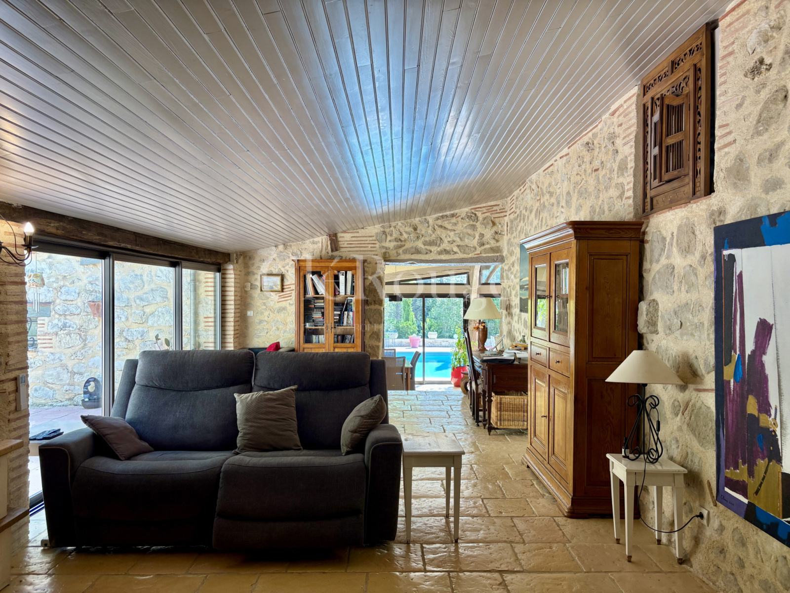 La cuisine, à la fois fonctionnelle et accueillante, s’ouvre sur un vaste séjour doté d’une cheminée et d’une vue dégagée sur la piscine. Un second salon plus intime donne accès à un patio, parfait pour les journées d’été. Trois chambres, une élégante salle de bains avec douche à l’italienne, un dressing et des espaces de vie bien pensés complètent l’ensemble.