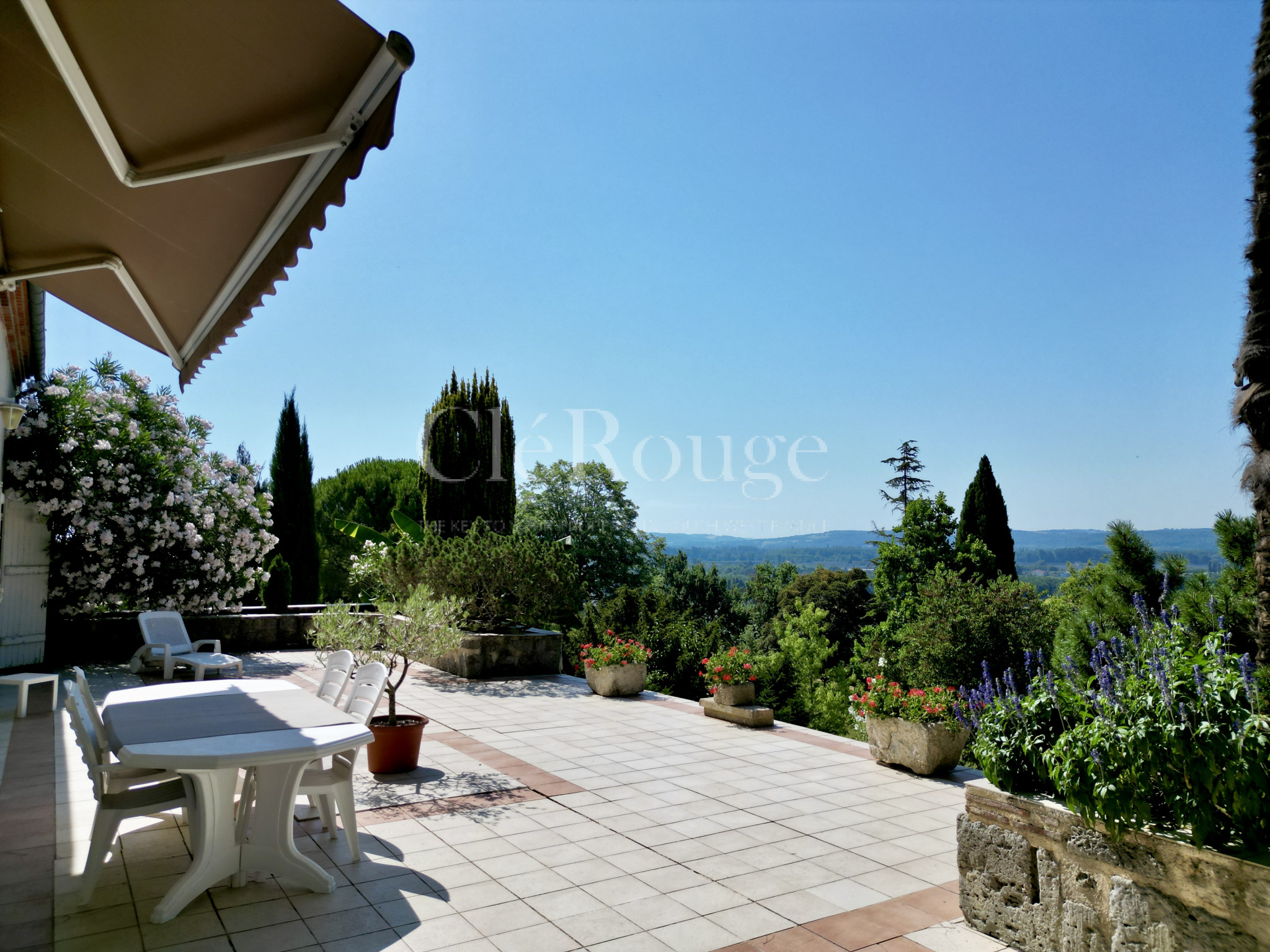 La cuisine, la salle à manger et le salon longent une grande terrasse ensoleillée offrant des vues panoramiques sur la campagne environnante. Chaque pièce bénéficie d’un accès direct à l’extérieur grâce à de nombreuses portes vitrées, apportant lumière naturelle et fluidité entre intérieur et extérieur.