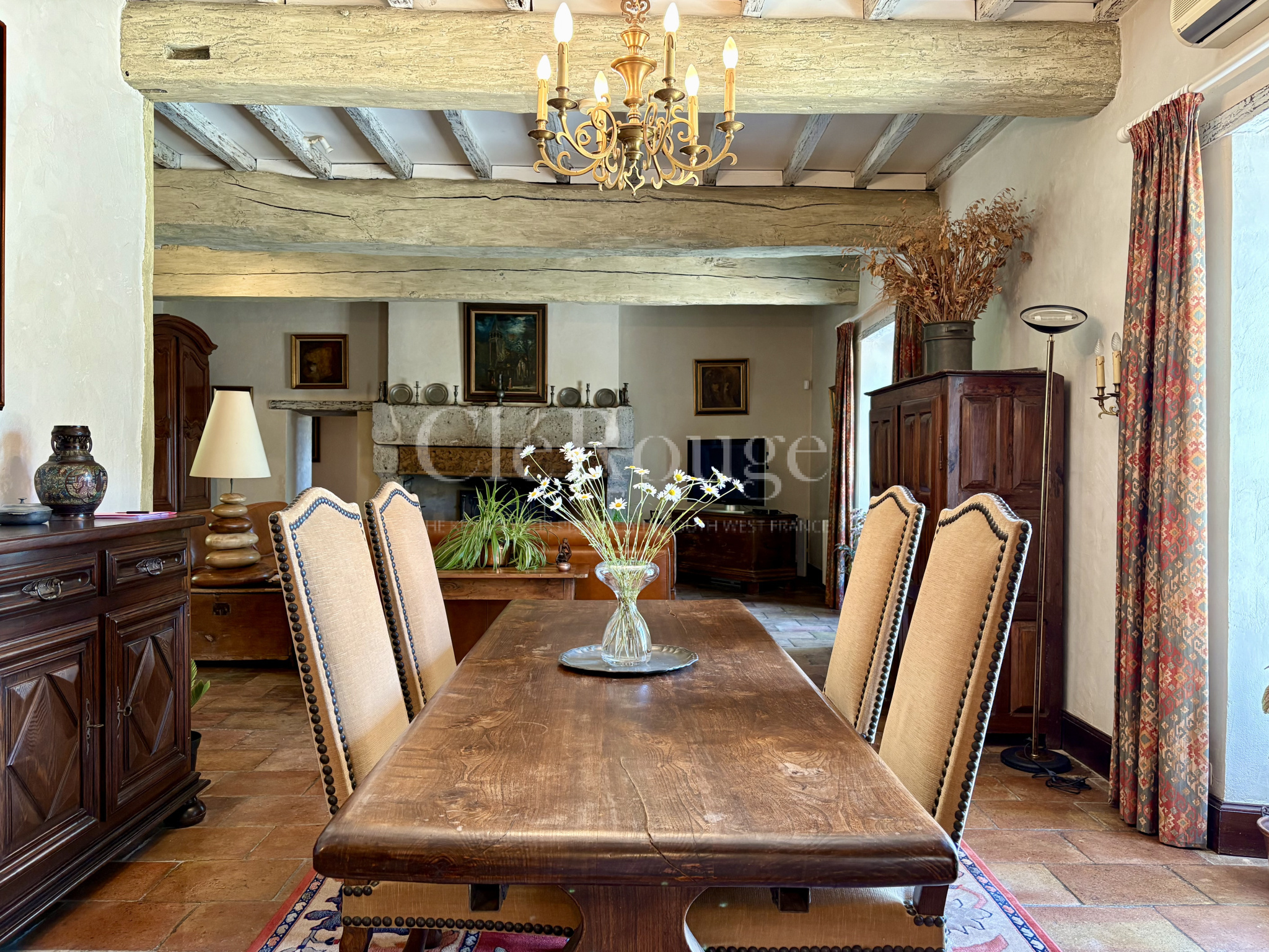 Le salon et la salle à manger forment un vaste espace de vie ouvert, encadré par une belle et imposante cheminée ancienne qui ajoute beaucoup de charme à l’ensemble.